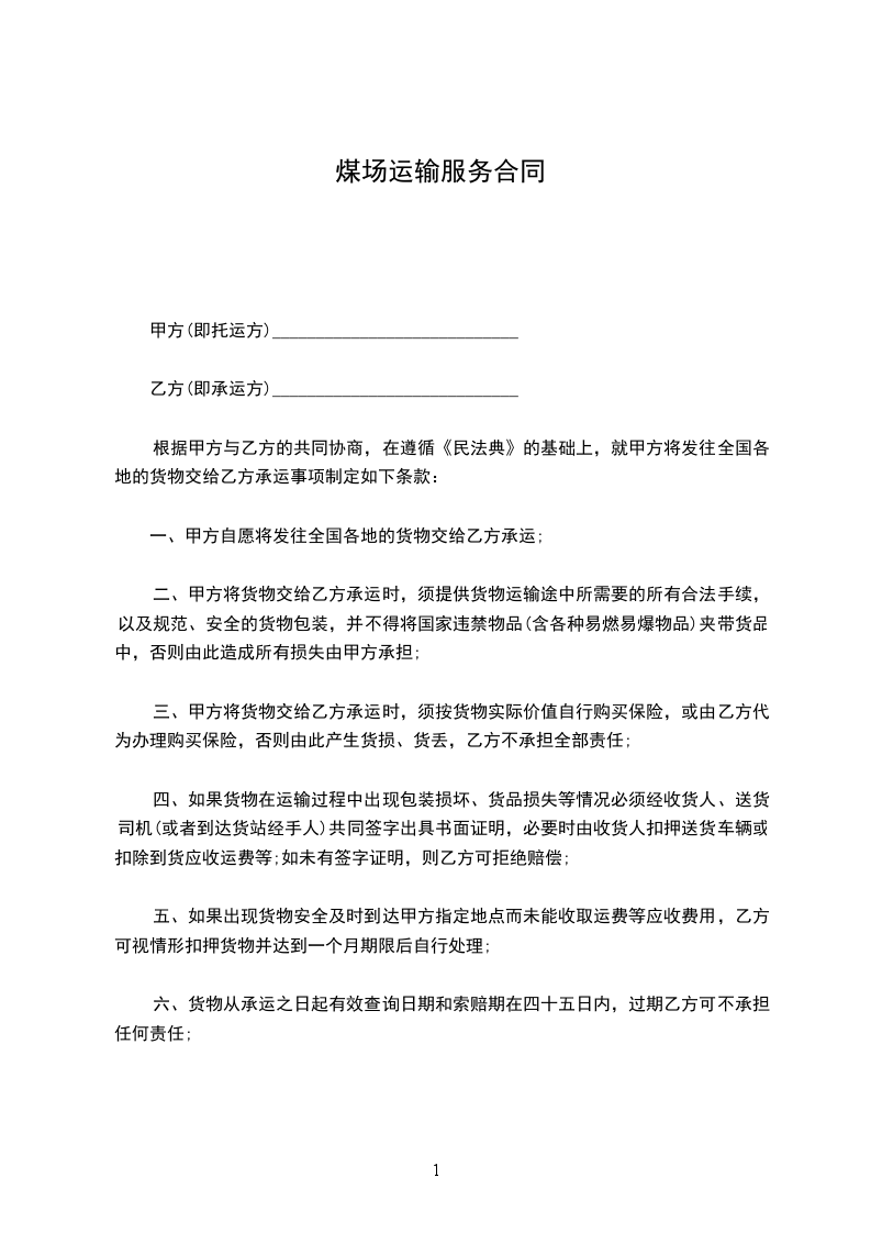根据甲方与乙方的共同协商,在遵循《民法典》的基础上,就甲方将发往全国各地的货物交给乙方承运事项制定如下条款: