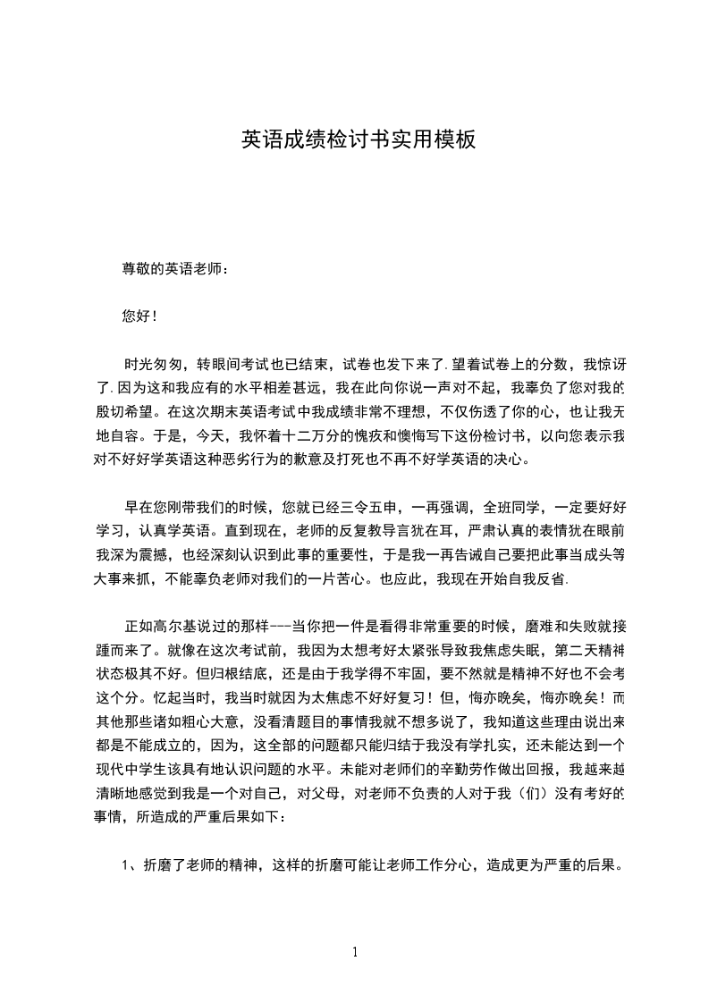 时光匆匆,转眼间考试也已结束,试卷也发下来了.望着试卷上的分数,我惊讶了.因为这和我应有的水平相差甚远,我在此向你说一声对不起,我辜负了您对我的殷切希望。在这次期末英语考试中我成绩非常不理想,不仅伤透了你的心,也让我无地自容。于是,今天,我怀着十二万分的愧疚和懊悔写下这份检讨书,以向您表示我对不好好学英语这种恶劣行为的歉意及打死也不再不好学英语的决心。