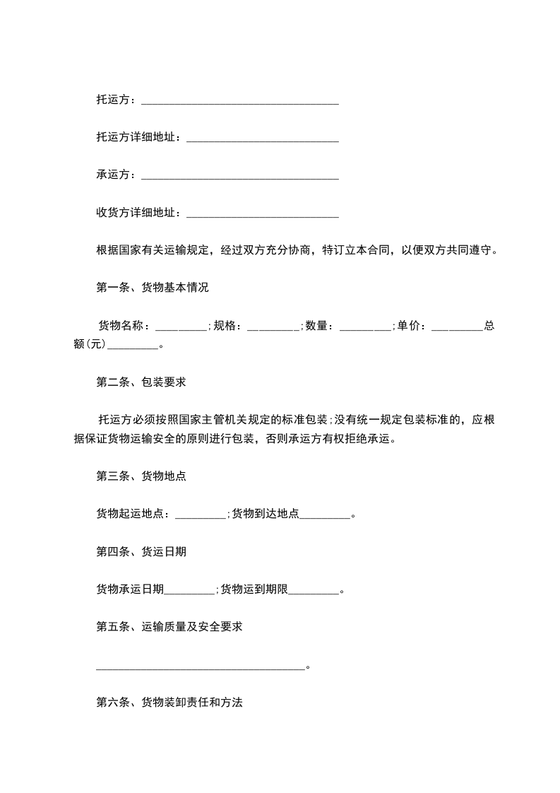 2.承运方的义务:在合同规定的期限内,将货物运到指定的地点,按时向收货人发出货物到达的通知。对托运的货物要负责安全,保证货物无短缺、无损坏、无人为的变质,如有上述问题,应承担赔偿义务。在货物到达以后,按规定的期限,负责保管。