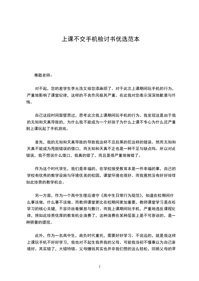 此外,作为一名高中生,肩负时代重托,需要好好学习。不说远的,就是我这样上课玩手机不好好学习,我也对不起生我养我的父母。可能我当初不懂事以为自己家境好,其实错了,大错特错。父母赚钱其实也并非我们想的这么轻松,回顾父母的早期,他们年轻时候那是多么的不容易。而骄奢忘旧,只会让我陷入痛苦地境地。尊敬的徐老师,您是我的恩师,此次错误多亏你的提醒,我此等的错误犯下,自己也感觉很惭愧,也觉得对不起你。