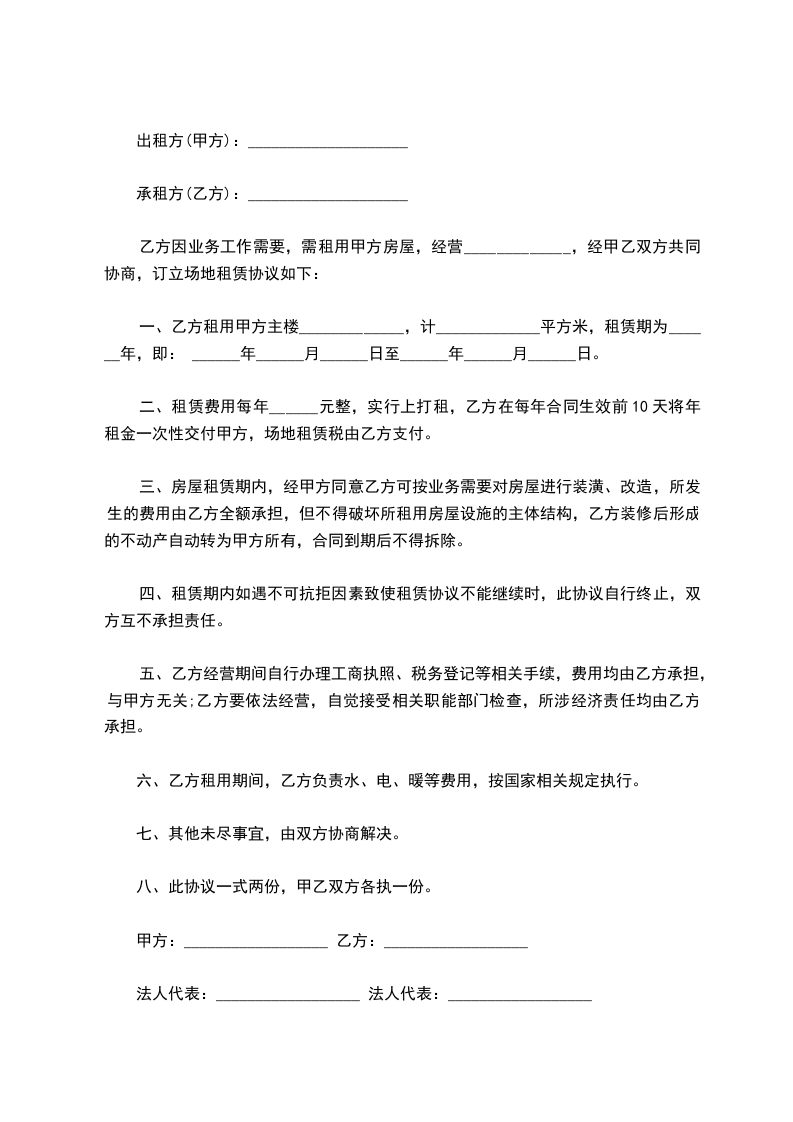 乙方因业务工作需要,需租用甲方房屋,经营_____________,经甲乙双方共同协商,订立场地租赁协议如下: