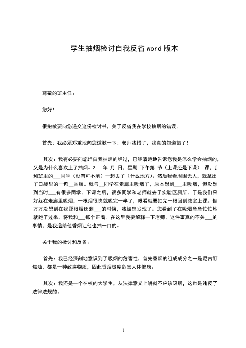其次:我有必要向您坦白我抽烟的经过,已经清楚地告诉您我是怎么学会抽烟的,又是为什么喜欢上了抽烟。2___年_月_日,星期_下午第_节(上课还是下课)_课,我和班里的___同学(没有可不填)一起去了(什么地方)。然后我看周围无人,就拿出了口袋里的一包__香烟。就与__同学在走廊里吸烟了,原本想到___里吸烟,但没想到当时___有很多同学。下课之后,很多同学和老师就去了实验区厕所。于是我们只好躲在走廊里吸烟,一根烟很快就吸完一半了,眼看就要抽完一根回到教室上课。但万万没想到在我那根烟还剩___的时候,我被您发现了。您看到了在吸烟急急忙忙地就跑了过来,将我和___抓个正着。在这里我要解释一下老师,这件事真的不关___的事情,是我递给他香烟让他也抽一口的。