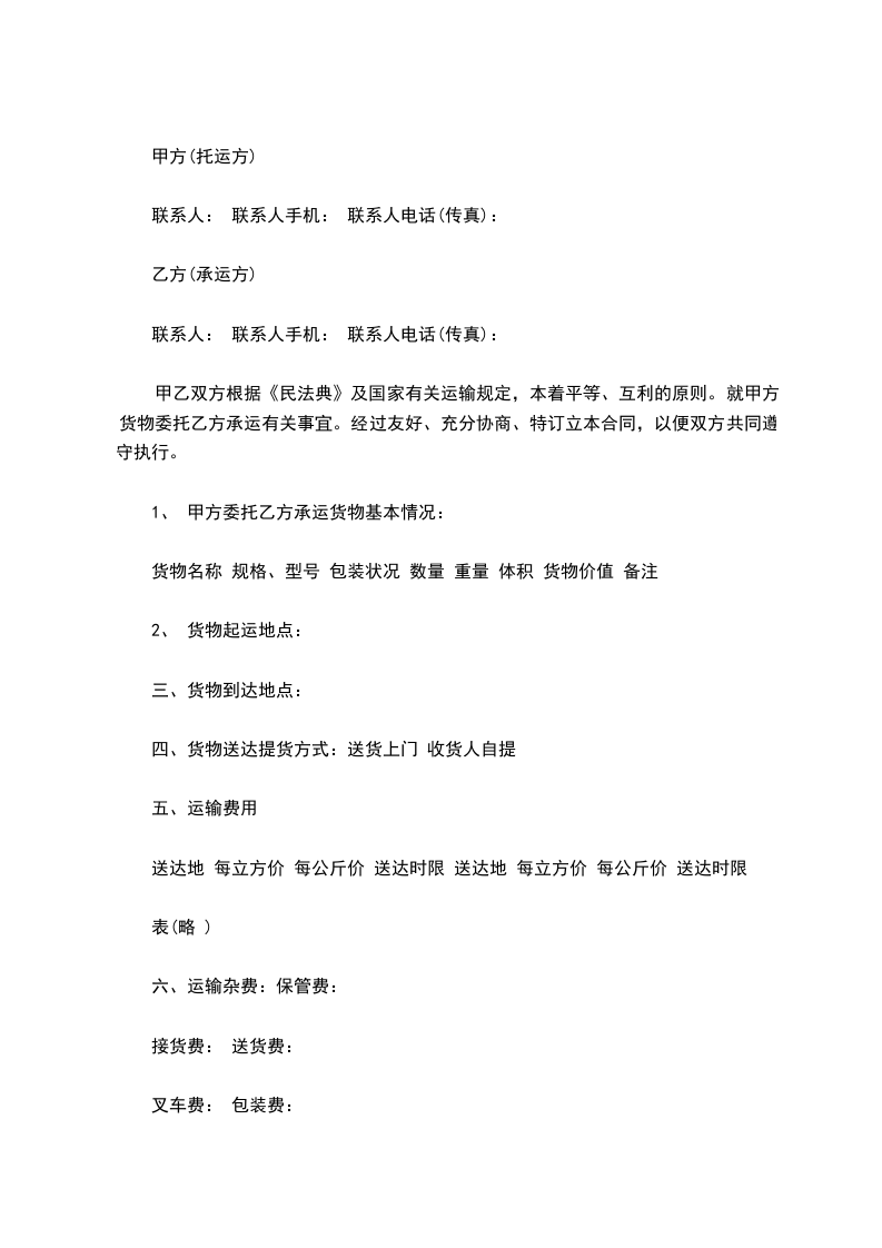甲乙双方根据《民法典》及国家有关运输规定,本着平等、互利的原则。就甲方货物委托乙方承运有关事宜。经过友好、充分协商、特订立本合同,以便双方共同遵守执行。