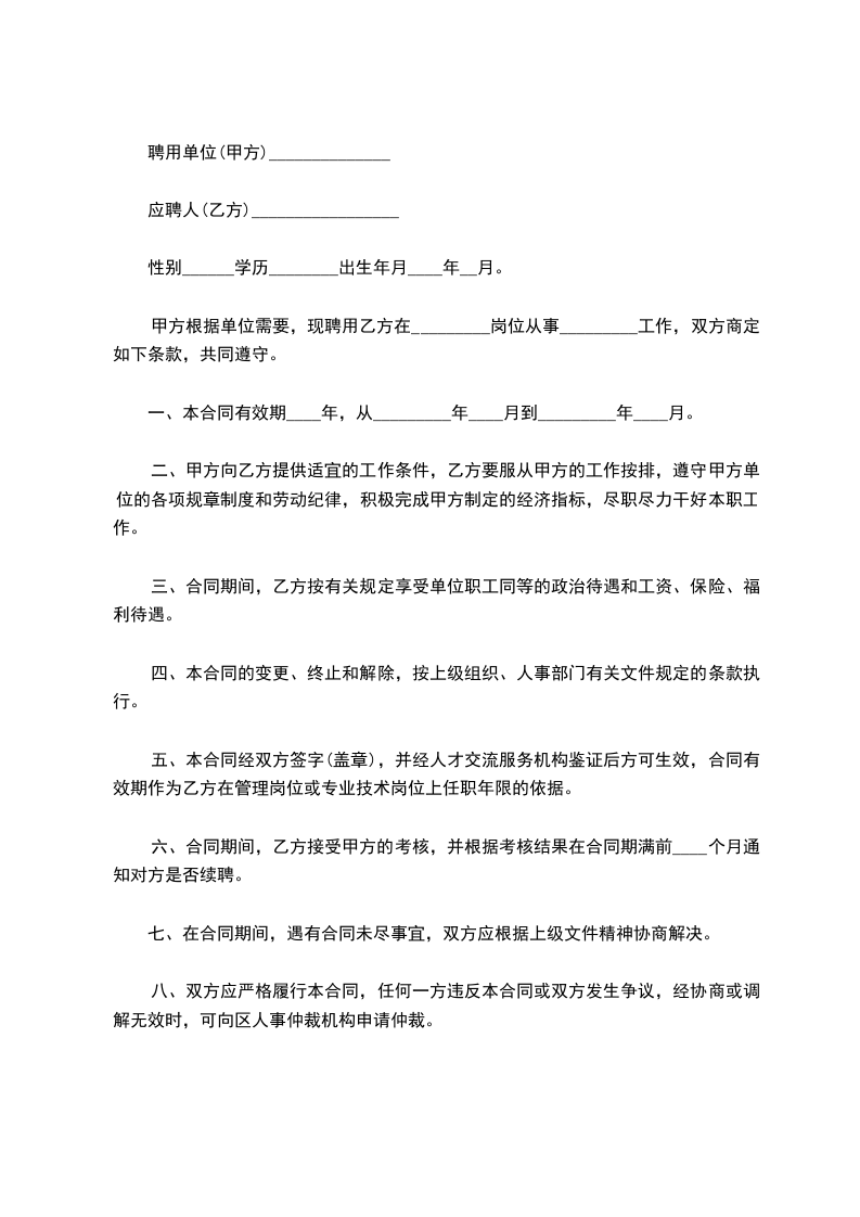 八、双方应严格履行本合同,任何一方违反本合同或双方发生争议,经协商或调解无效时,可向区人事仲裁机构申请仲裁。