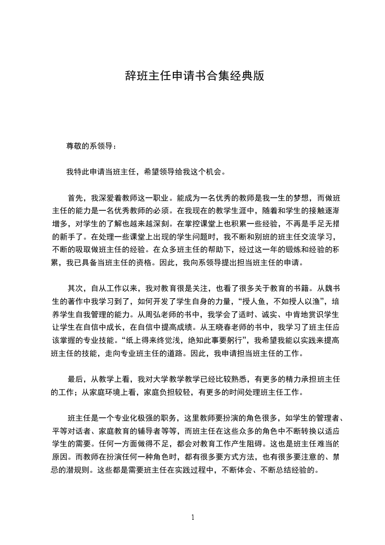 我特此申请当班主任,希望领导给我这个机会。