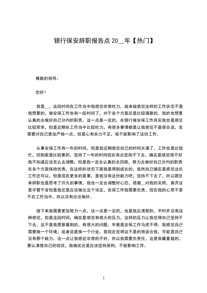 我是__,这段时间在工作当中我感觉非常吃力,越来越感觉这样的工作状态不是我想要的,做安保工作也有一段时间了,对于各个方面还是比较满意的,我的也想要认真的去做好自己分内的职责,这一点是一定的,在银行做安保工作其实我也是感觉比较荣幸,但是近期在工作当中比较吃力,有很多事情都是让我感觉不是很合适,我需要对自己更加严格一点,但是心有余力不足,我不能影响了这份工作。