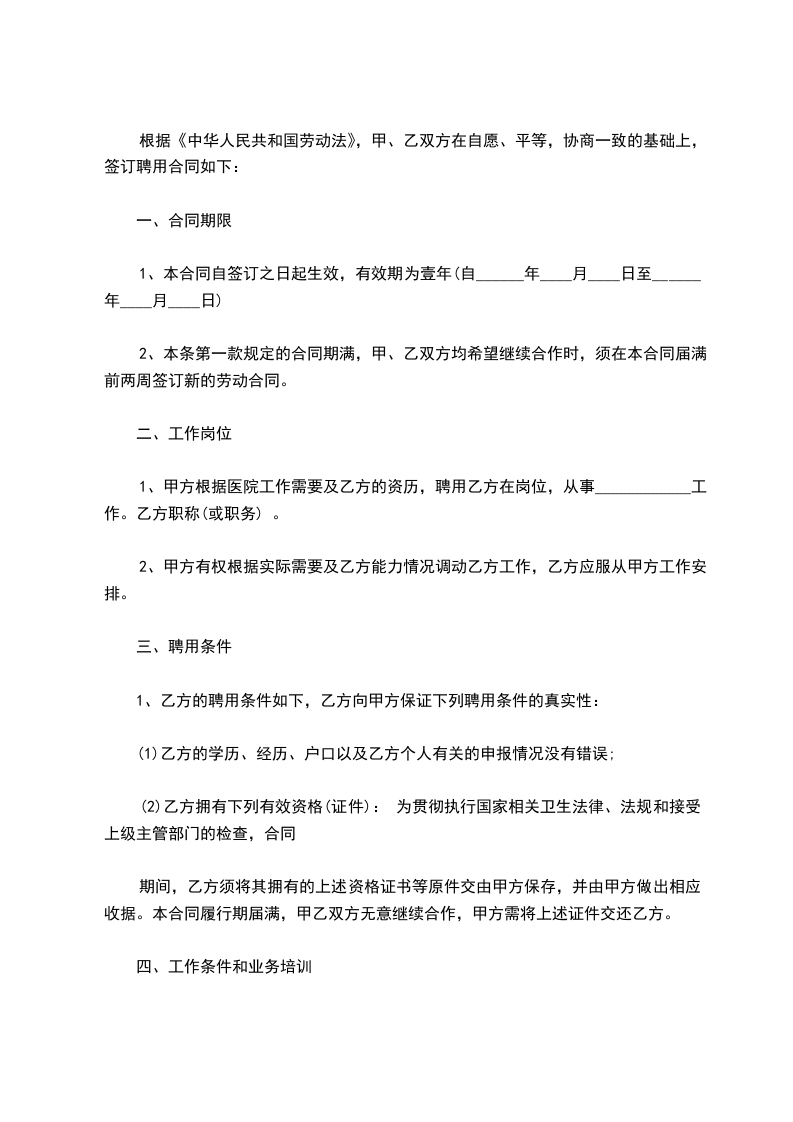 1、甲方根据医院工作需要及乙方的资历,聘用乙方在岗位,从事____________工作。乙方职称(或职务) 。