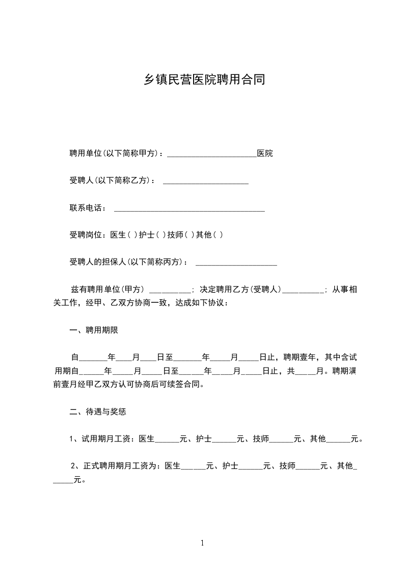 1、试用期月工资:医生______元、护士______元、技师______元、其他______元。
