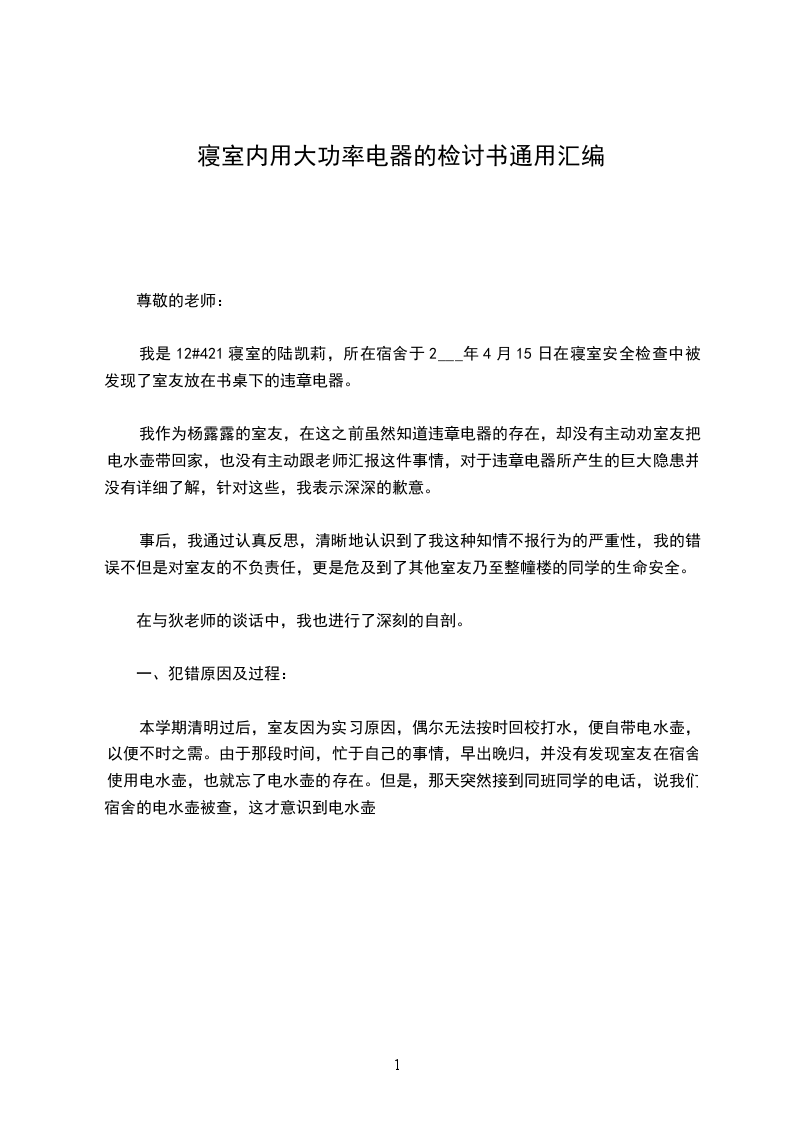 还有,宿管老师,如果这一次的事情让学校对您进行处罚的话,我们愿意去学校请罪,毕竟这是我们明知故犯的错误,我们不能让宿管老师您为此而扣工资,是我们自己的错,我们自己愿意承担,不能连累了您!请您一定要相信我们愿意为您作证,您是多次要求我们不准用大功率的,是我们自己不顾您的安危使用的!