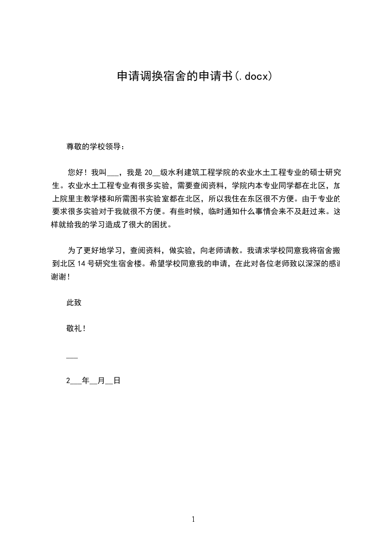 您好!我叫___,我是20__级水利建筑工程学院的农业水土工程专业的硕士研究生。农业水土工程专业有很多实验,需要查阅资料,学院内本专业同学都在北区,加上院里主教学楼和所需图书实验室都在北区,所以我住在东区很不方便。由于专业的要求很多实验对于我就很不方便。有些时候,临时通知什么事情会来不及赶过来。这样就给我的学习造成了很大的困扰。