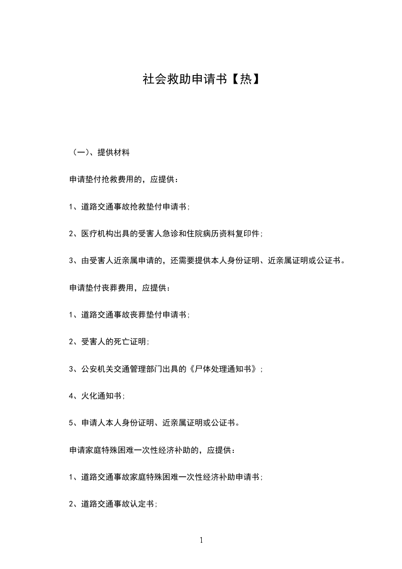 1、道路交通事故家庭特殊困难一次性经济补助申请书;