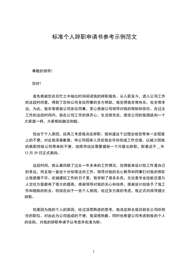 但由于个人原因,经再三考虑我决定辞职。我知道这个过程会给您带来一定程度上的不便,对此我深表歉意。待公司招来人员后我会尽快完成工作交接,以减少因我的离职而给公司带来的不便。按照劳动法需要提前一个月提出辞职,即最迟于__年12月29日正式离岗。
