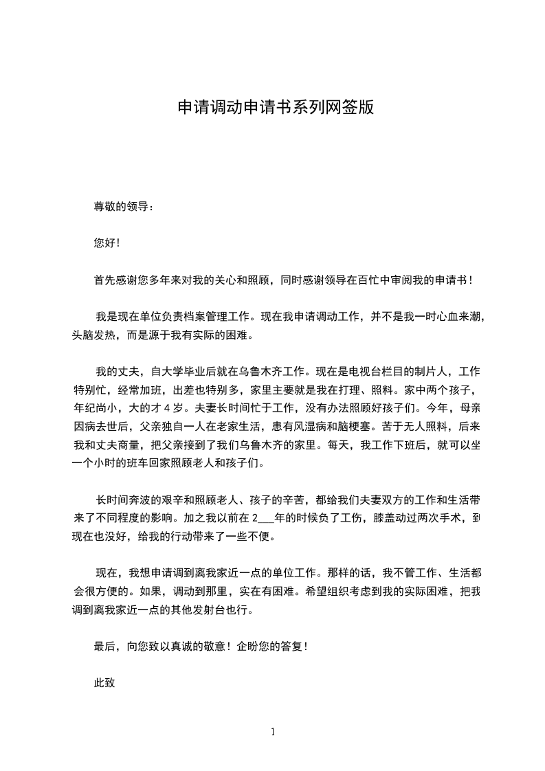 我是现在单位负责档案管理工作。现在我申请调动工作,并不是我一时心血来潮,头脑发热,而是源于我有实际的困难。