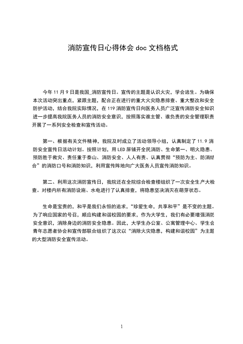 今年11月9日是我国_消防宣传日。宣传的主题是认识火灾,学会逃生。为确保本次活动突出重点,紧跟主题,配合正在进行的重大火灾隐患排查、重大整改和安全防护活动,结合我院实际情况,在119消防宣传日向医务人员广泛宣传消防安全知识,进一步提高我院医务人员的消防安全意识,按照落实谁主管、谁负责的安全管理职责,开展了一系列安全检查和宣传活动。