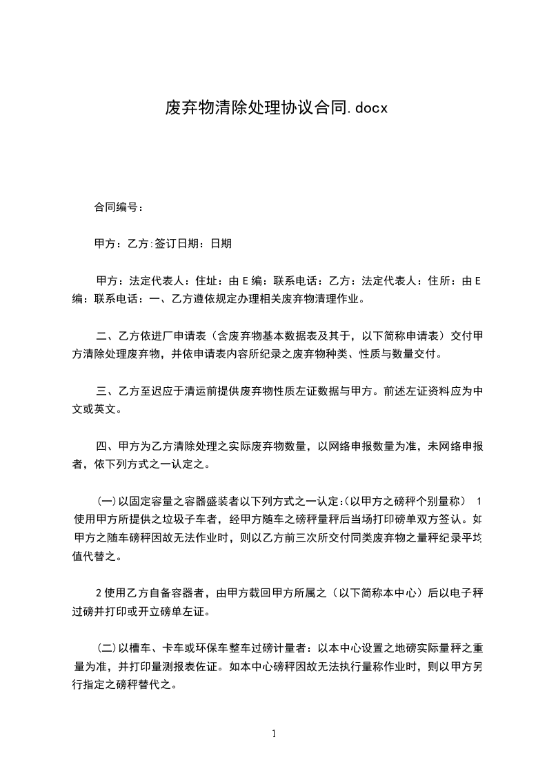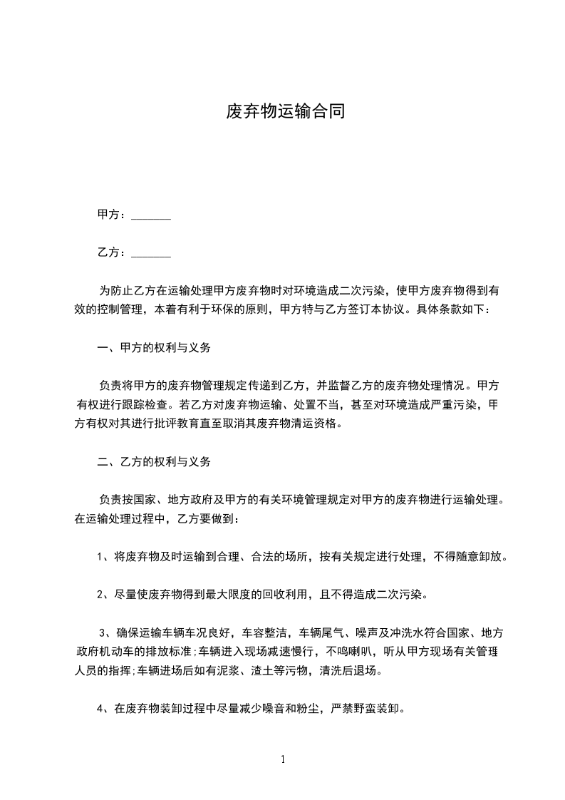 为防止乙方在运输处理甲方废弃物时对环境造成二次污染,使甲方废弃物得到有效的控制管理,本着有利于环保的原则,甲方特与乙方签订本协议。具体条款如下: