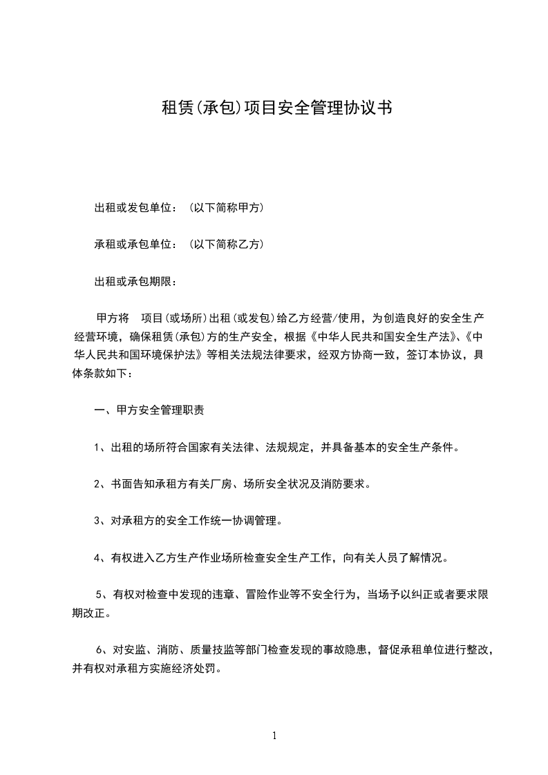 甲方将 项目(或场所)出租(或发包)给乙方经营/使用,为创造良好的安全生产经营环境,确保租赁(承包)方的生产安全,根据《中华人民共和国安全生产法》、《中华人民共和国环境保护法》等相关法规法律要求,经双方协商一致,签订本协议,具体条款如下: