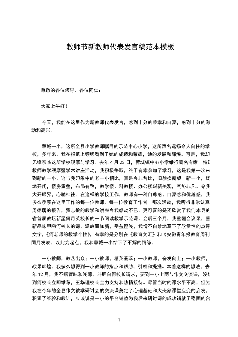 今天,我能在这里作为新教师代表发言,感到十分的荣幸和自豪,感到十分的激动和高兴。