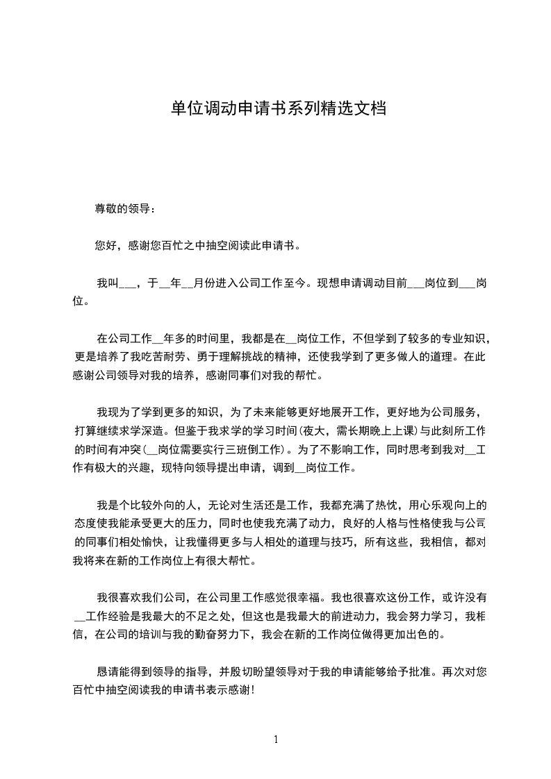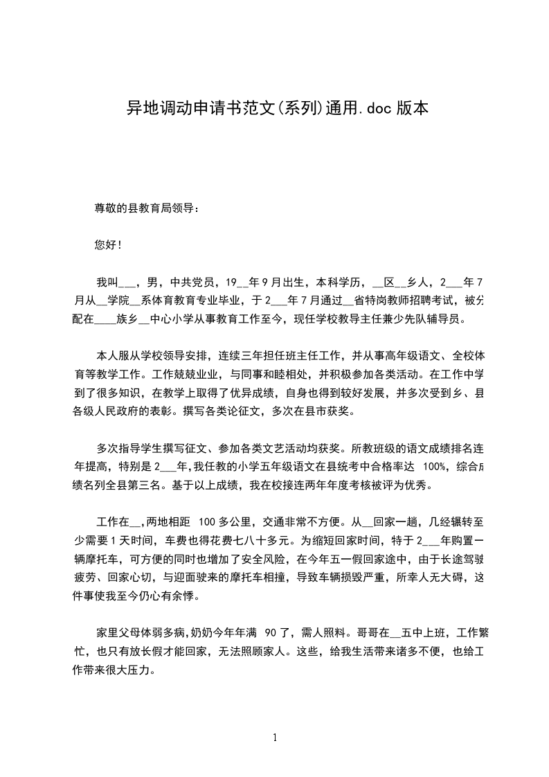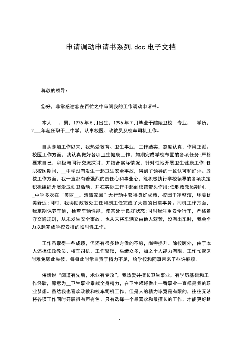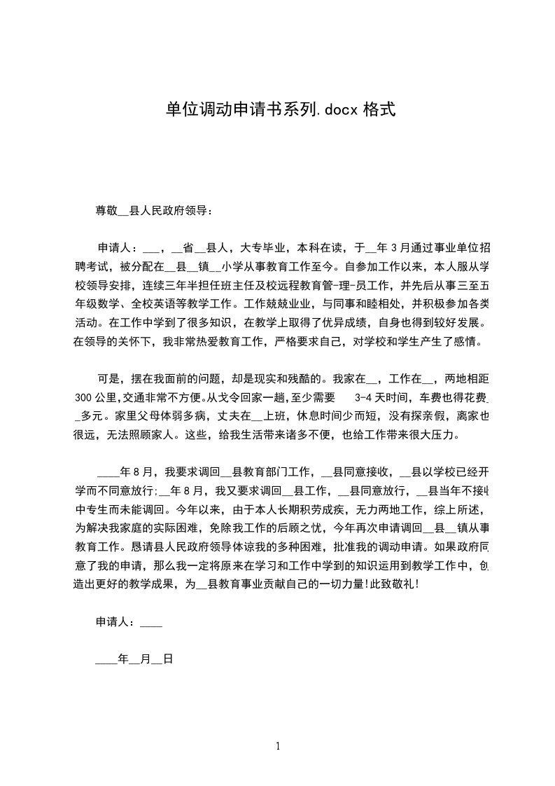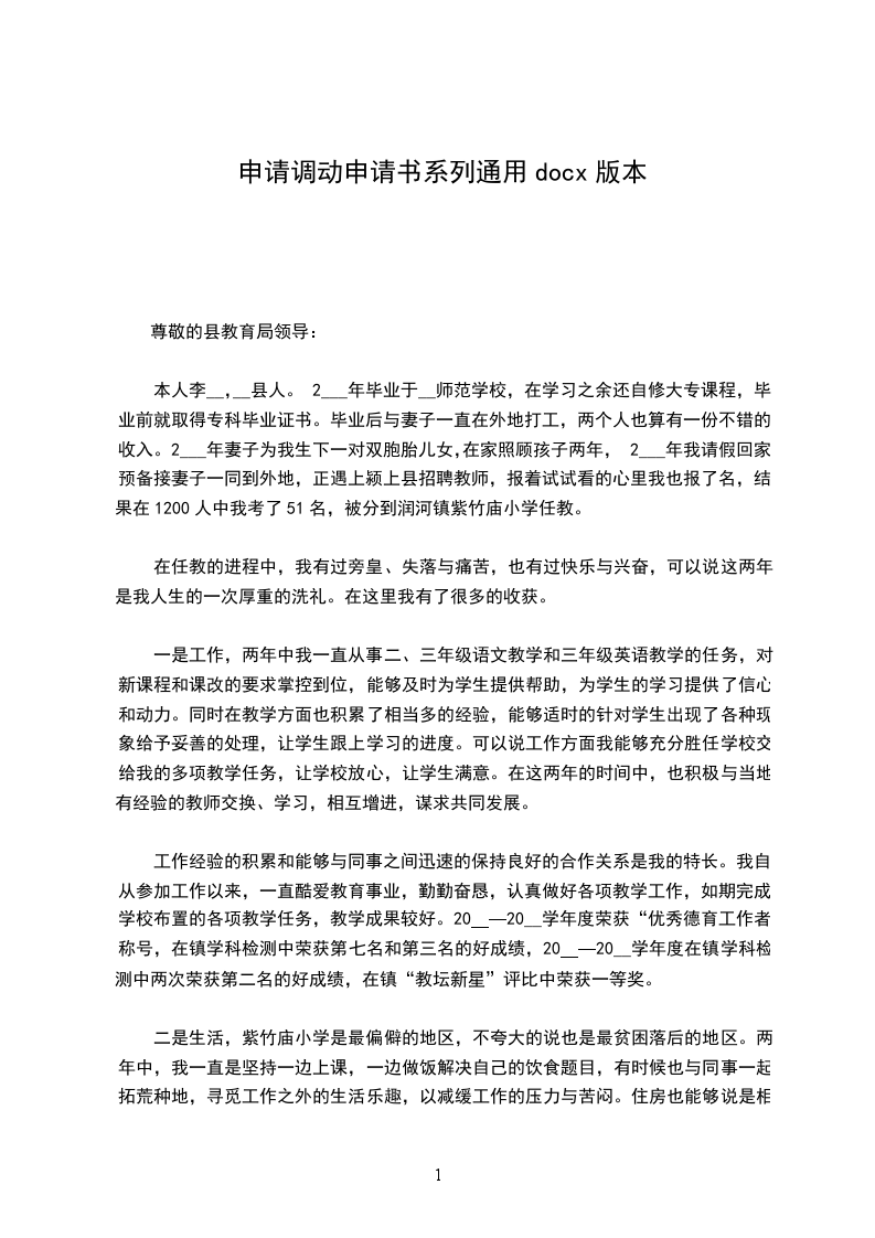 我希望调入县城或离家较近的学校工作。恳请局领导体谅我的多种困难,批准我的调动申请。如果领导同意了我的申请,我将以更加饱满的热情和昂扬的斗志投身于本职工作中,将原来在学习和工作中学到的知识运用到教学工作中,创造出更好的教学成果,为__县教育事业贡献自己的一切力量!