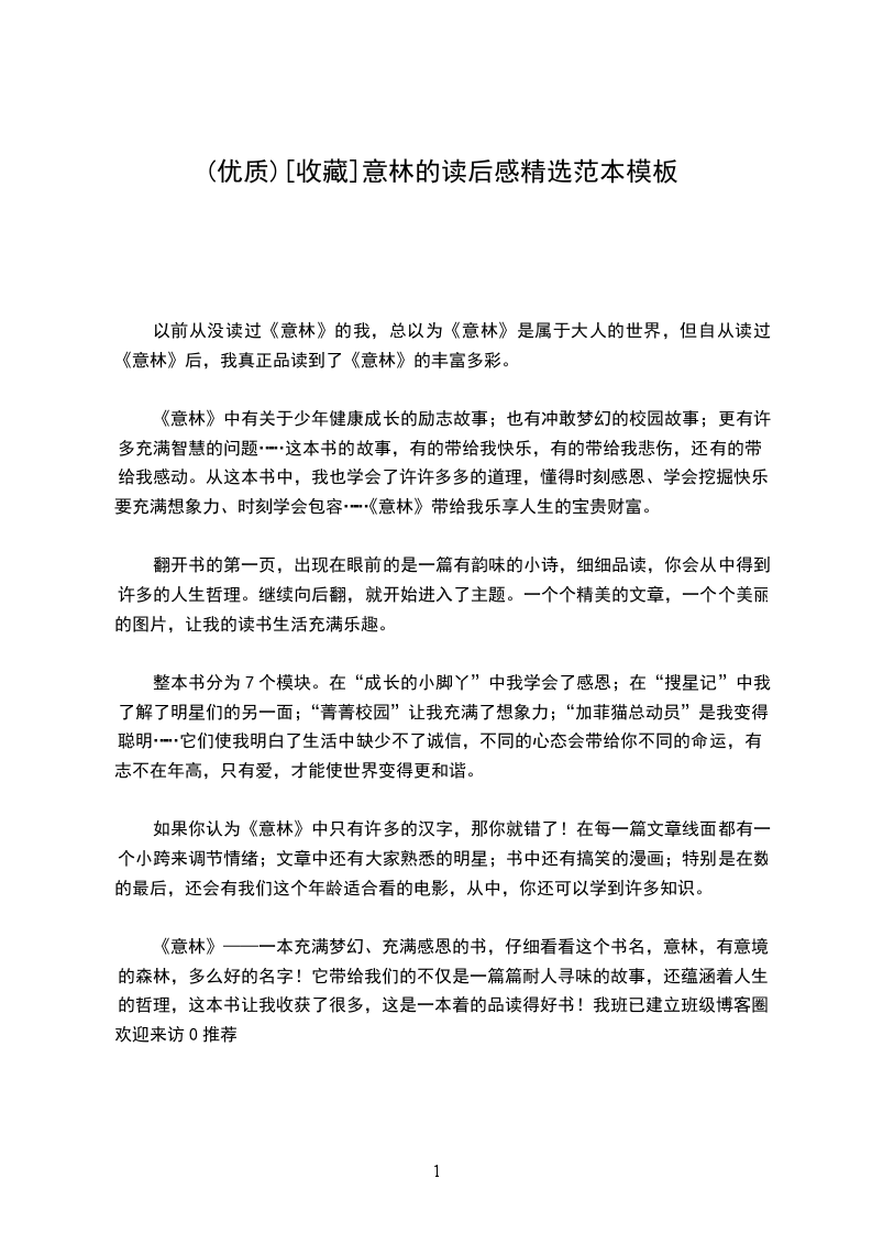 《意林》——一本充满梦幻、充满感恩的书,仔细看看这个书名,意林,有意境的森林,多么好的名字!它带给我们的不仅是一篇篇耐人寻味的故事,还蕴涵着人生的哲理,这本书让我收获了很多,这是一本着的品读得好书!我班已建立班级博客圈,欢迎来访0推荐