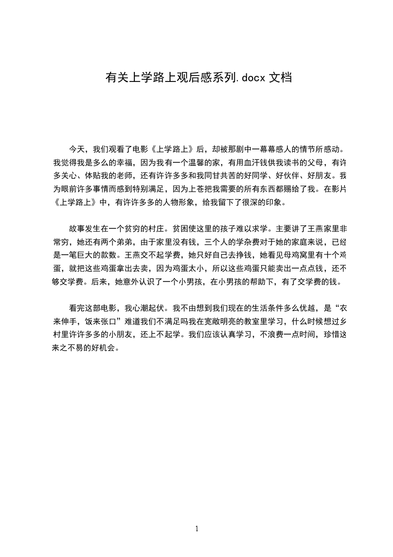 今天,我们观看了电影《上学路上》后,却被那剧中一幕幕感人的情节所感动。我觉得我是多么的幸福,因为我有一个温馨的家,有用血汗钱供我读书的父母,有许多关心、体贴我的老师,还有许许多多和我同甘共苦的好同学、好伙伴、好朋友。我为眼前许多事情而感到特别满足,因为上苍把我需要的所有东西都赐给了我。在影片《上学路上》中,有许许多多的人物形象,给我留下了很深的印象。