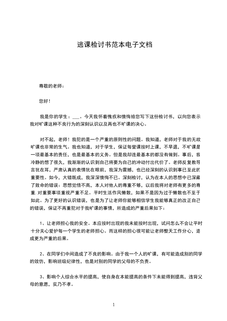 我是你的学生:___。今天我怀着愧疚和懊悔给您写下这份检讨书,以向您表示我对旷课这种不良行为的深刻认识以及再也不旷课的决心。