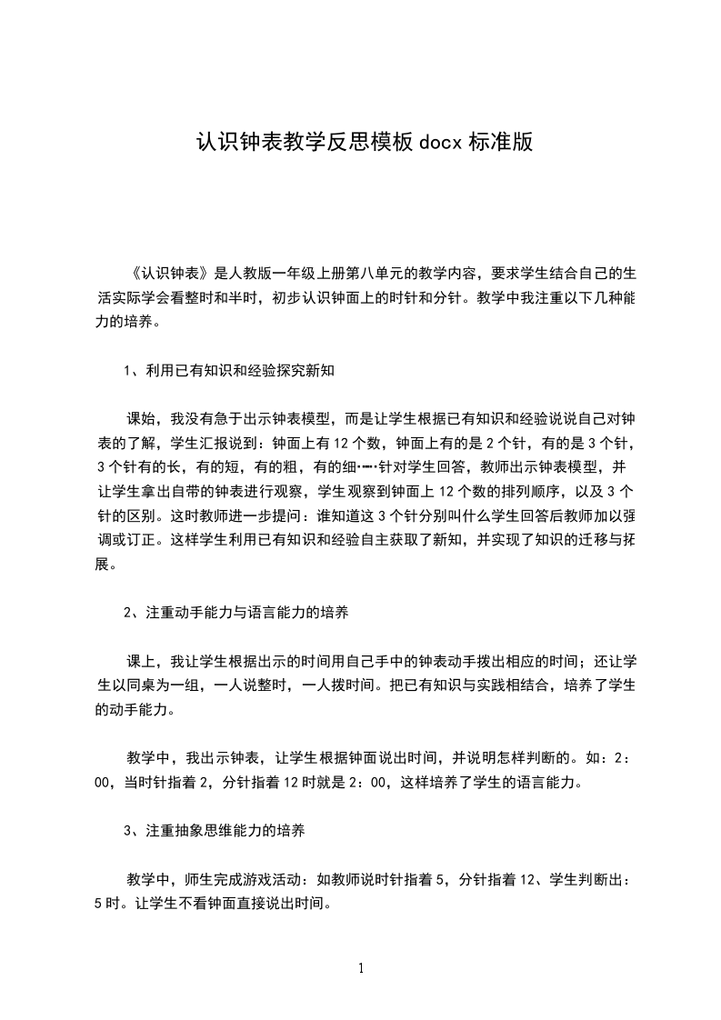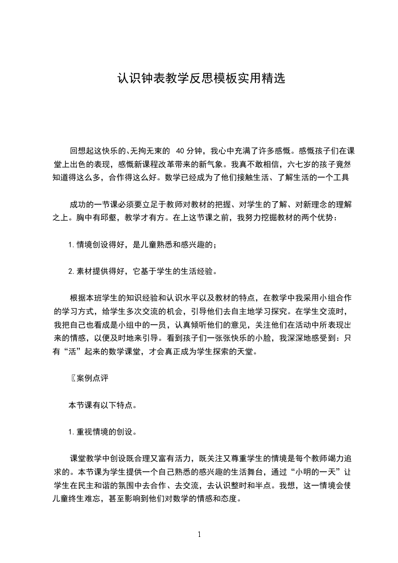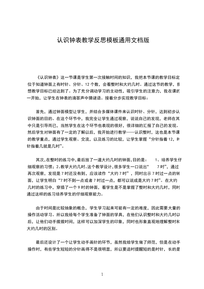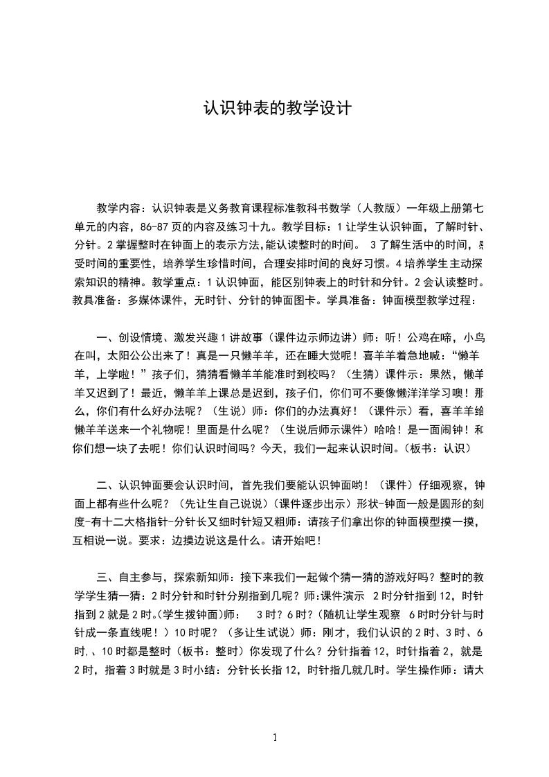 1、由于我对新课程教材的理解不够深入,要让学生对钟面、时针、分针有一个初步的了解,能够在钟表和电子表上读写整个时间,初步树立时间观念,显然是不够的,数学学习的目的不应是简单地再现和积累学生的经验。