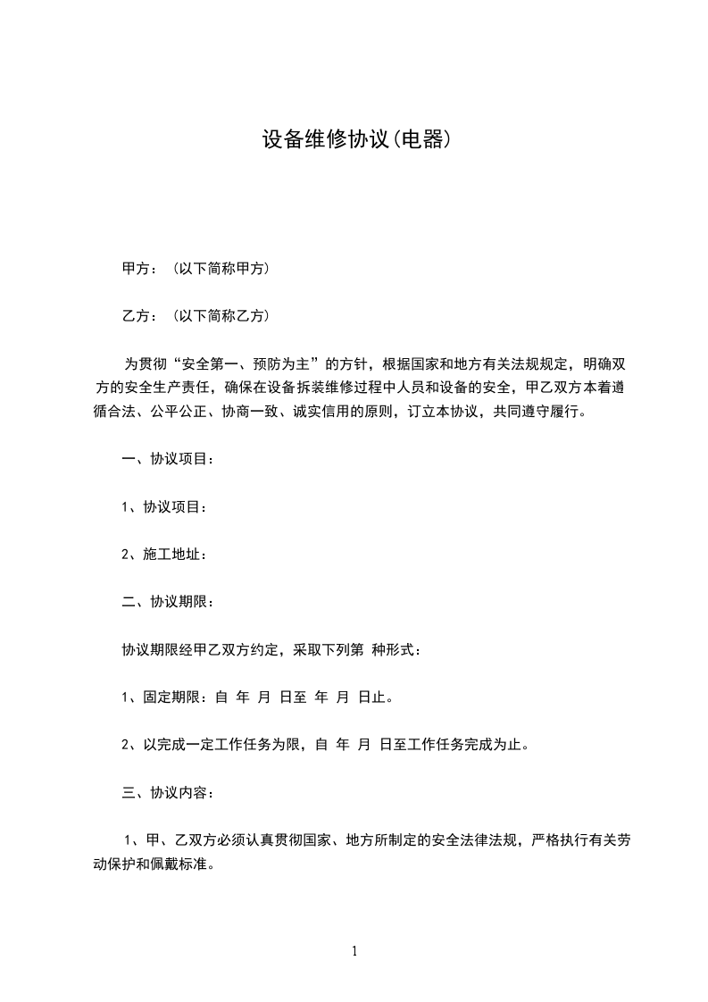 为贯彻“安全第一、预防为主”的方针,根据国家和地方有关法规规定,明确双方的安全生产责任,确保在设备拆装维修过程中人员和设备的安全,甲乙双方本着遵循合法、公平公正、协商一致、诚实信用的原则,订立本协议,共同遵守履行。