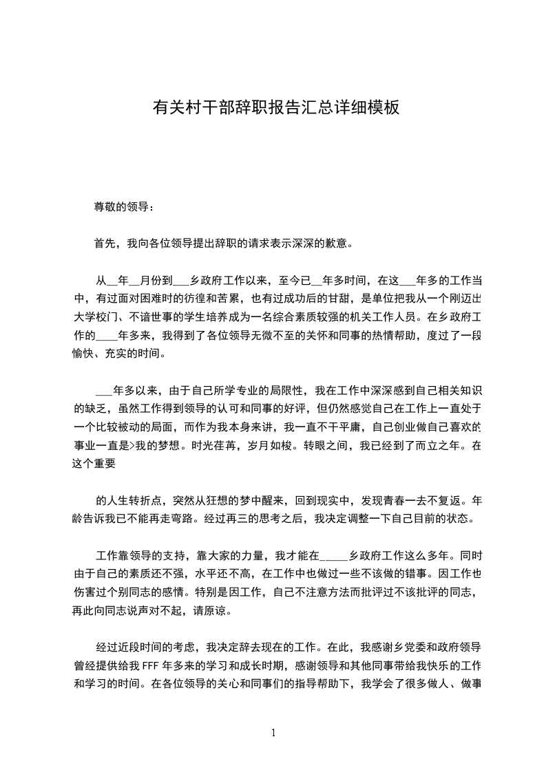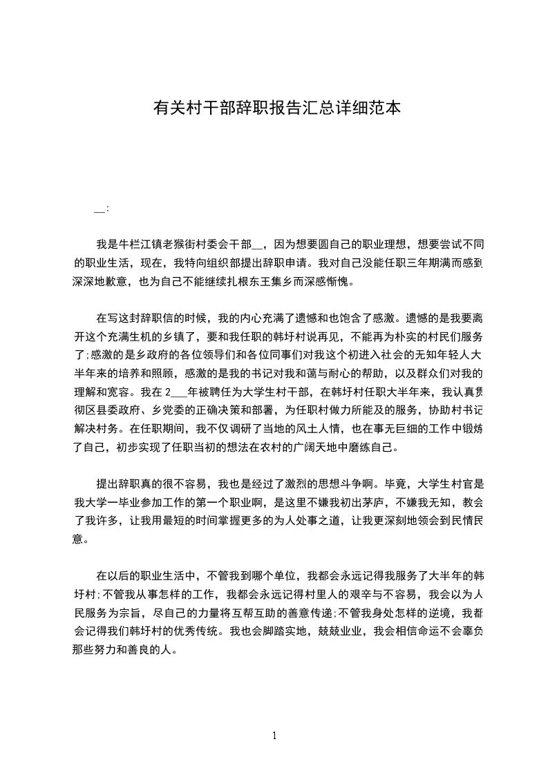 在写这封辞职报告的时候,我的内心充满了遗憾和也饱含了感激。遗憾的是我要离开这个充满生机的乡镇了,要和我任职的韩圩村说再见,不能再为朴实的村民们服务了;感激的是乡政府的各位领导们和各位同事们对我这个初进入社会的无知年轻人大半年来的培养和照顾,感激的是我的书记对我和蔼与耐心的帮助,以及群众们对我的理解和宽容。我在__年被聘任为大学生村干部,在韩圩村任职大半年来,我认真贯彻区县委政府、乡党委的正确决策和部署,为任职村做力所能及的服务,协助村书记解决村务。在任职期间,我不仅调研了当地的风土人情,也在事无巨细的工作中锻炼了自己,初步实现了任职当初的想法在农村的广阔天地中磨练自己。