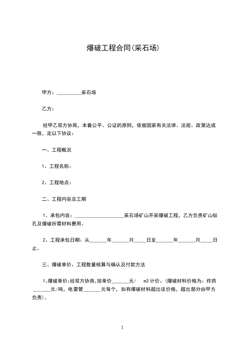 1、承包内容:____________________采石场矿山开采爆破工程,乙方负责矿山钻孔及爆破所需材料费用。
