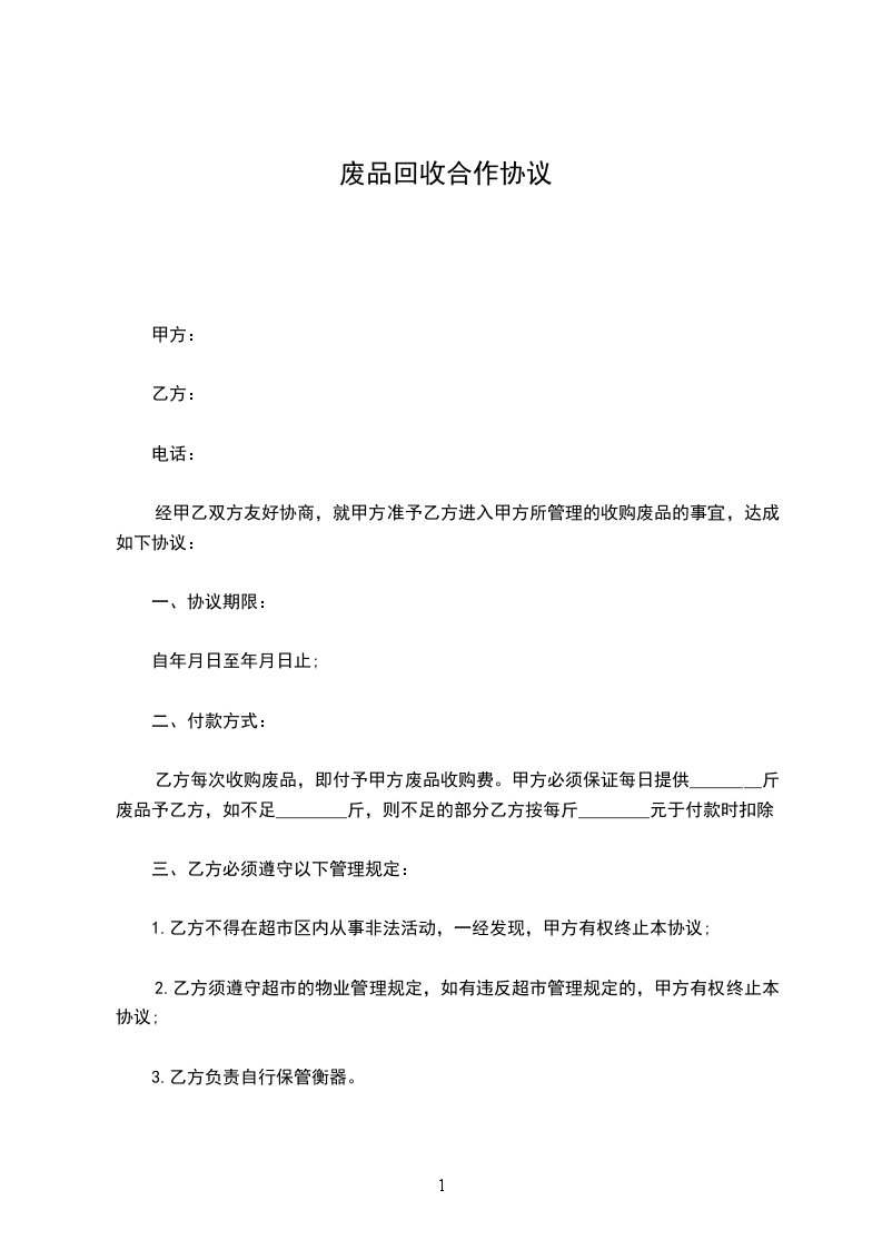 经甲乙双方友好协商,就甲方准予乙方进入甲方所管理的收购废品的事宜,达成如下协议: