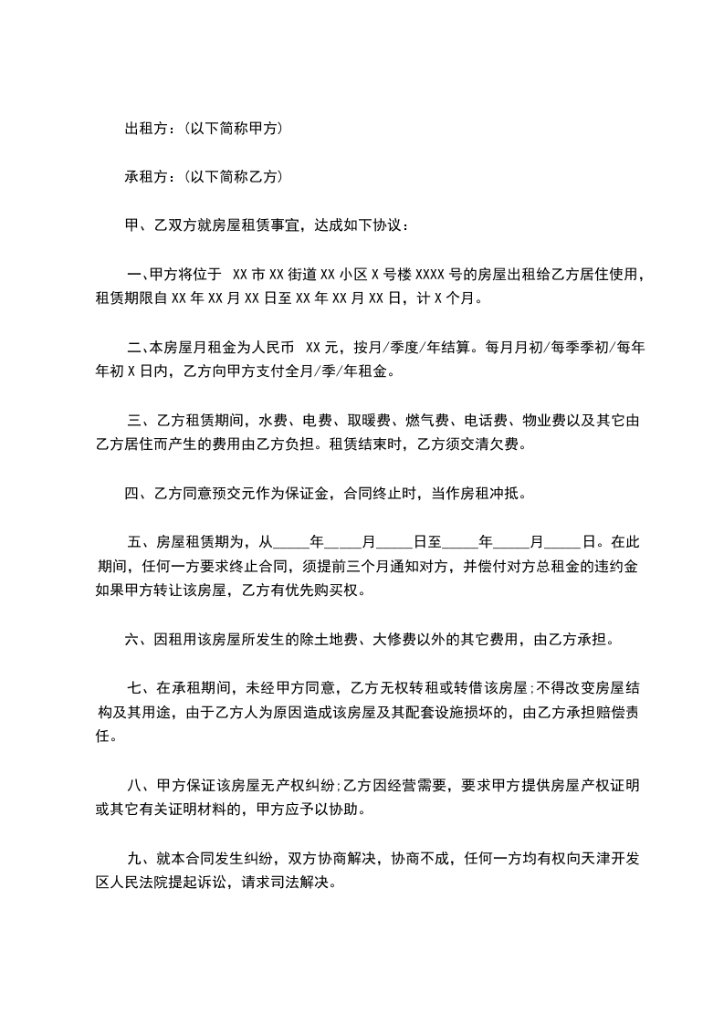 一、甲方将位于XX市XX街道XX小区X号楼XXXX号的房屋出租给乙方居住使用,租赁期限自XX年XX月XX日至XX年XX月XX日,计X个月。