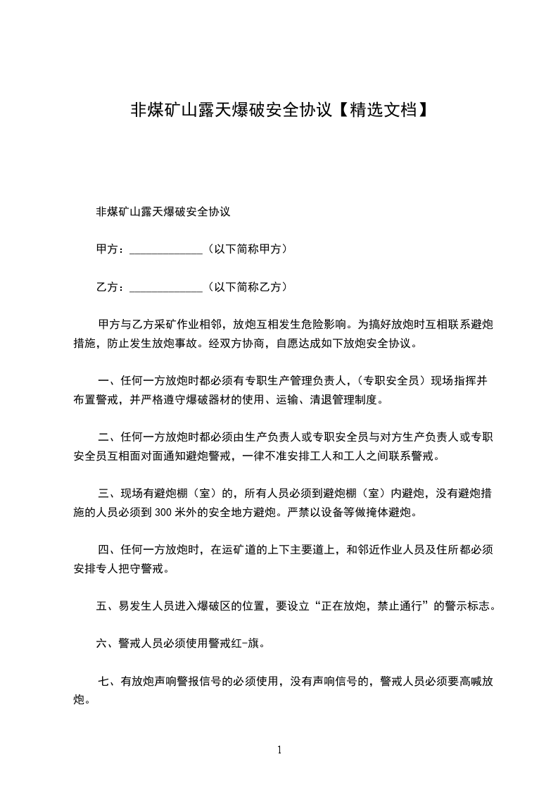 与 采矿作业相邻,放炮互相发生危险影响。为搞好放炮时互相联系避炮措施,防止发生放炮事故。经双方协商,自愿达成如下放炮安全协议。