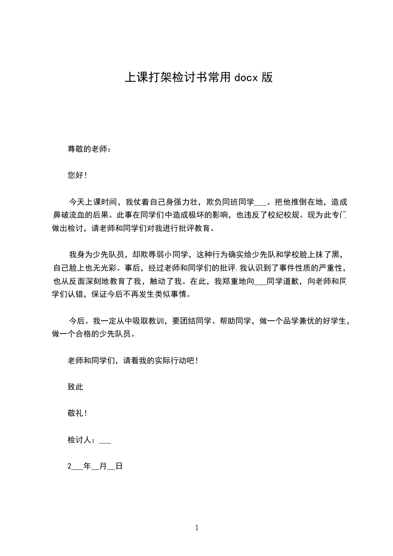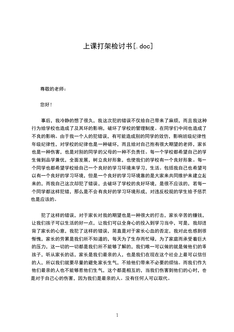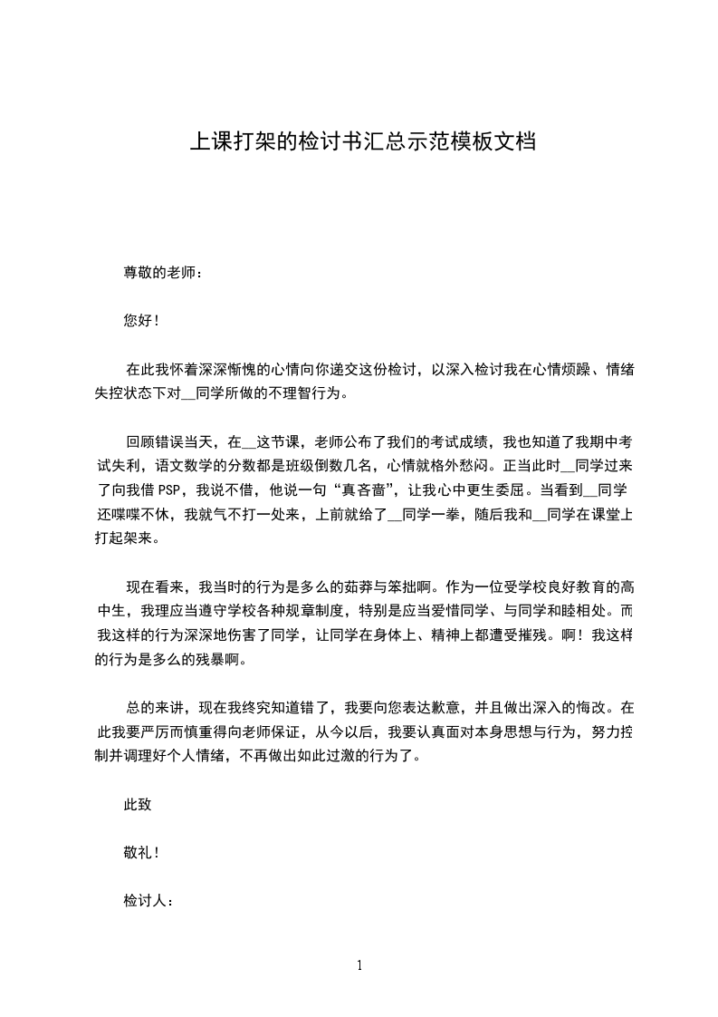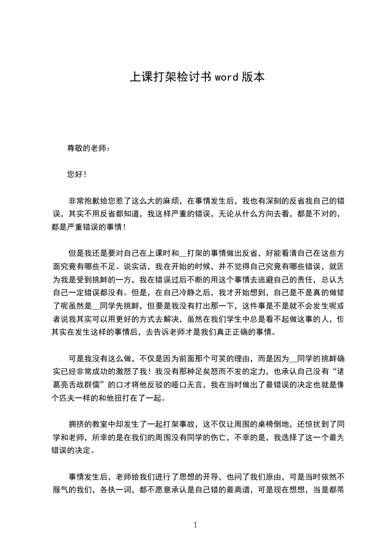 我是___,很抱歉在您的课堂上跟同学打架了,上课就没有好好上,把时间花在这样的事情上,对不起您的辛苦教育。在此学生已知错了,并向您真诚的道歉和检讨。