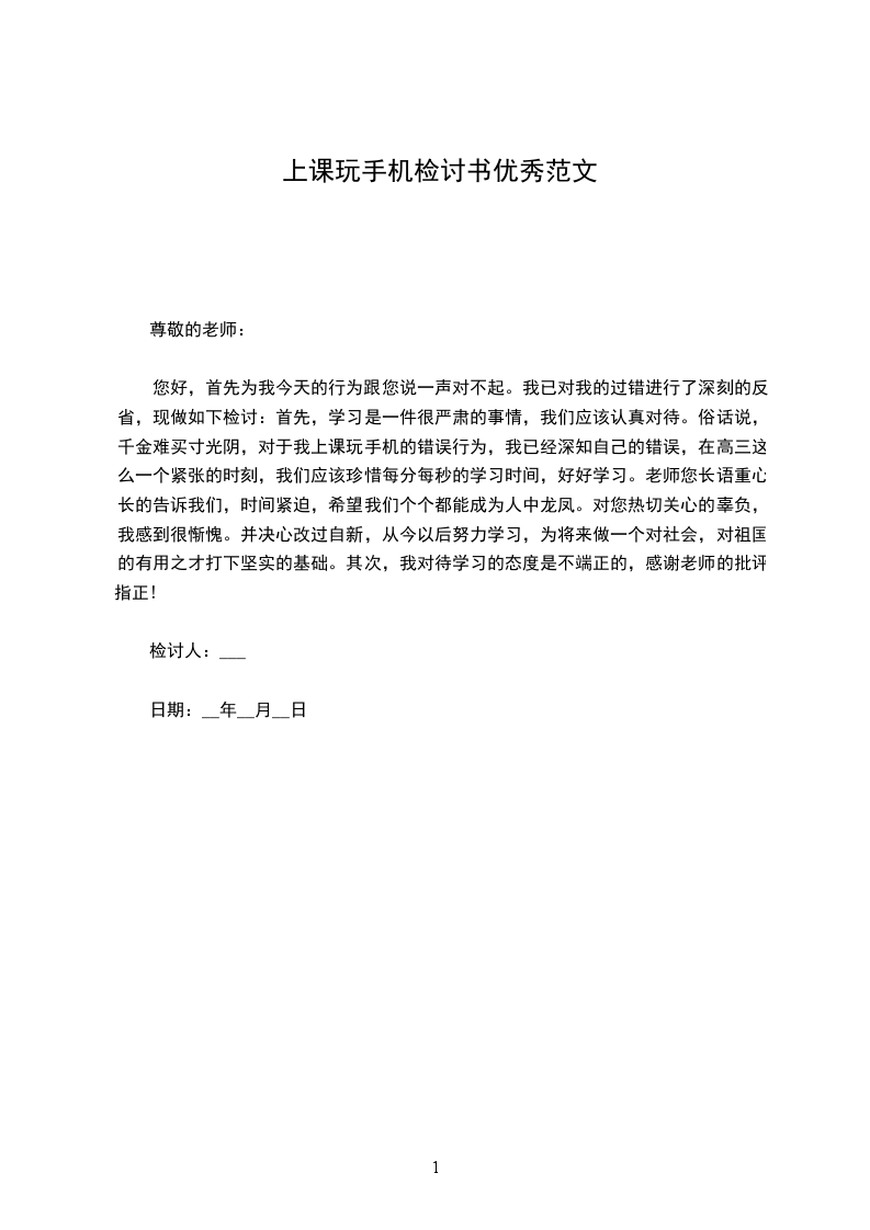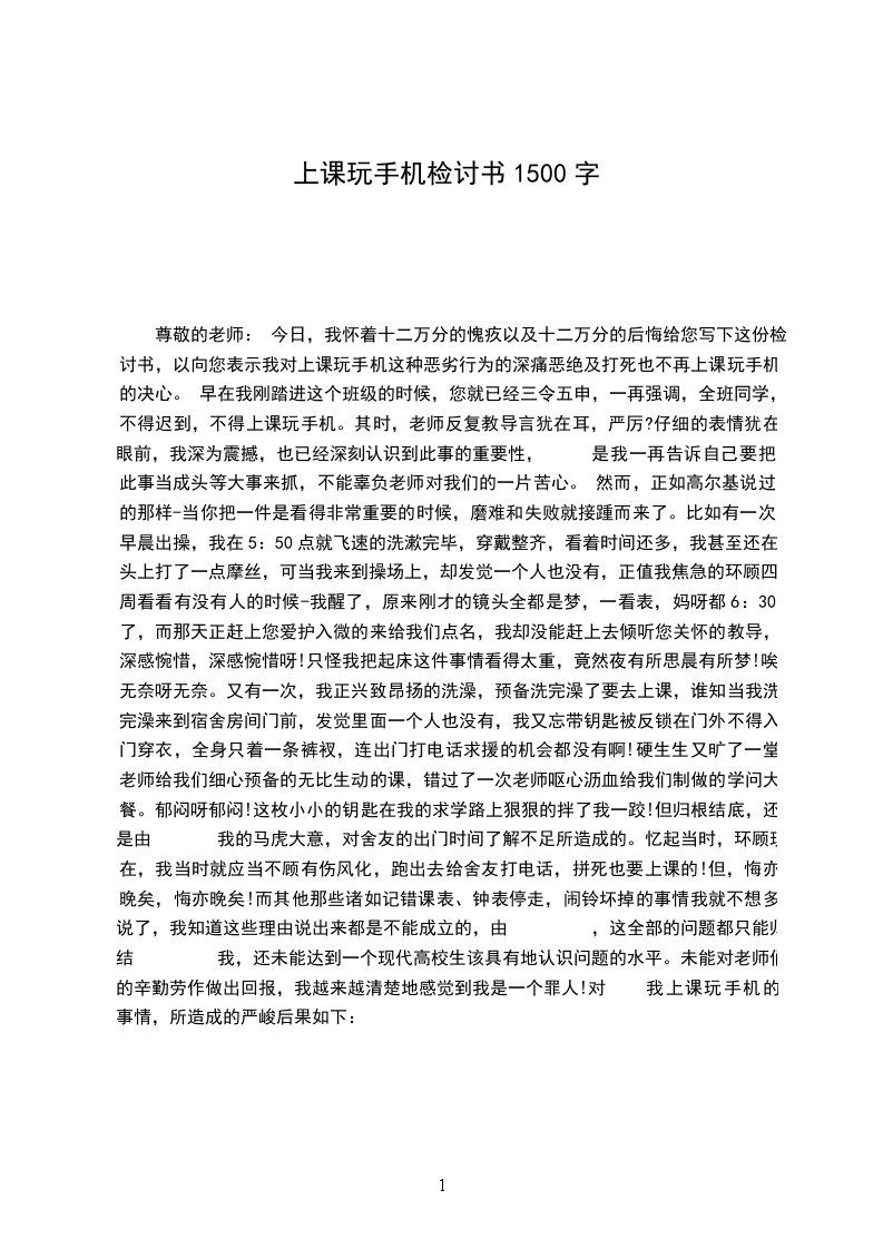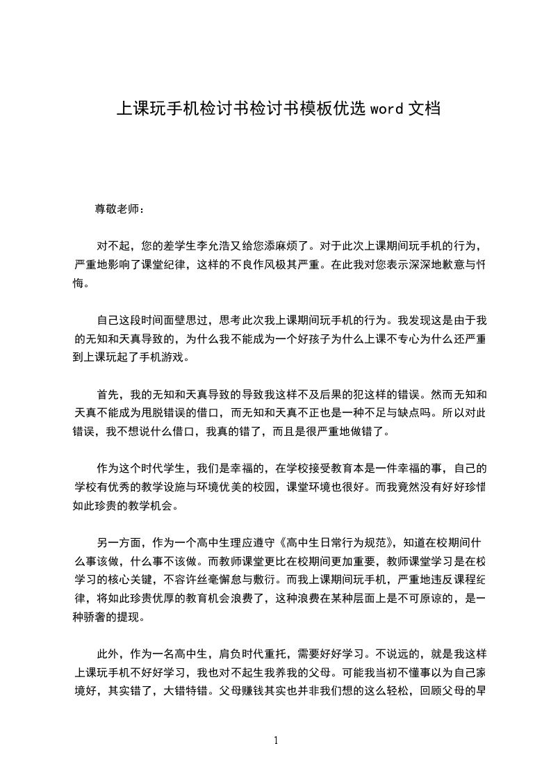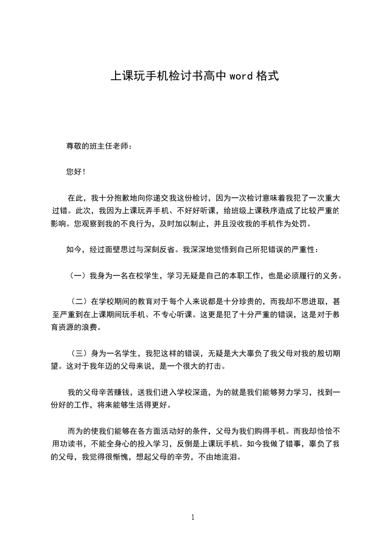 此外,作为一名高中生,肩负时代重托,需要好好学习。不说远的,就是我这样上课玩手机不好好学习,我也对不起生我养我的父母。可能我当初不懂事以为自己家境好,其实错了,大错特错。父母赚钱其实也并非我们想的这么轻松,回顾父母的早期,他们年轻时候那是多么的不容易。而骄奢忘旧,只会让我陷入痛苦地境地。尊敬的徐老师,您是我的恩师,此次错误多亏你的提醒,我此等的错误犯下,自己也感觉很惭愧,也觉得对不起你。