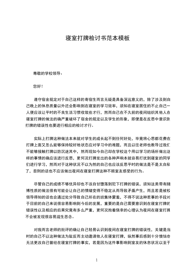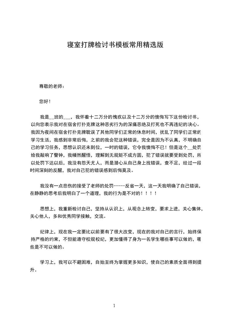 我是__班的___,我怀着十二万分的愧疚以及十二万分的懊悔写下这份检讨书,以向您表示我对在宿舍打扑克牌这种恶劣行为的深痛恶绝及打死也不再违纪的决心。我因为夜间在宿舍打扑克牌耽误了其他同学们正常的休息时间,扰乱了同学们正常的学习生活,我感到非常后悔,之前的我会犯这种错误,完全是因为不认真,不明确自己的学习任务,思想认识还未到位,一时的错误,它令我懊悔不已!但是这个__处罚给我敲响了警钟,我幡然醒悟,理解到无规矩不成方圆,犯了错误就要受到处罚,所以处罚下达以后,我没有怨天尤人,而是潜心从自己身上找错误,查不足,经过一段时间深刻的反醒,我对自己犯的错误感到后悔莫及。