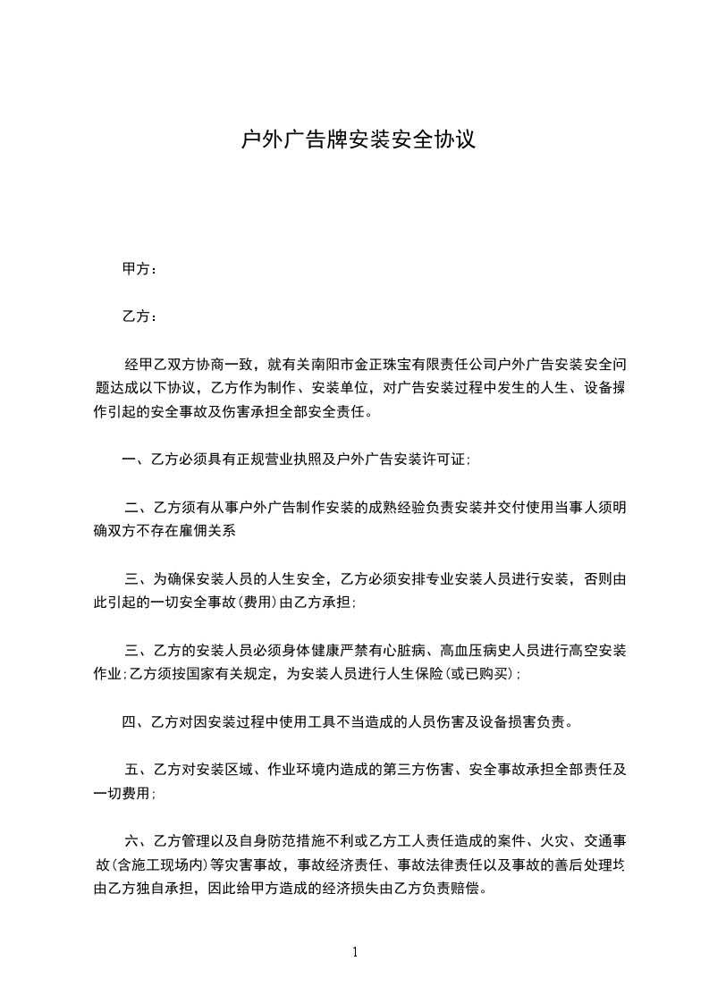 经甲乙双方协商一致,就有关南阳市金正珠宝有限责任公司户外广告安装安全问题达成以下协议,乙方作为制作、安装单位,对广告安装过程中发生的人生、设备操作引起的安全事故及伤害承担全部安全责任。