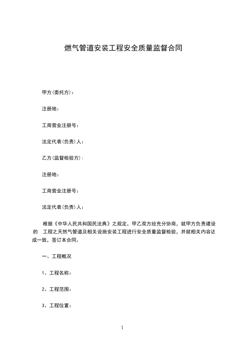 根据《中华人民共和国民法典》之规定,甲乙双方经充分协商,就甲方负责建设的 工程之天然气管道及相关设施安装工程进行安全质量监督检验,并就相关内容达成一致,签订本合同。