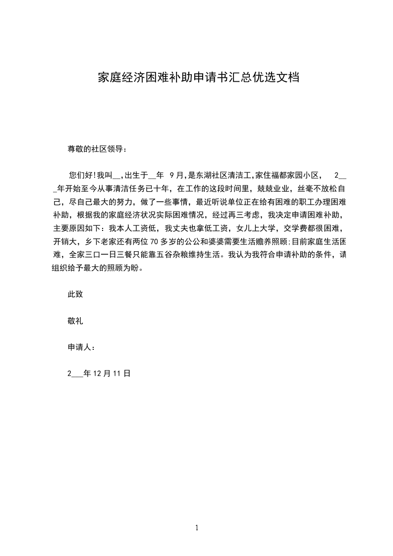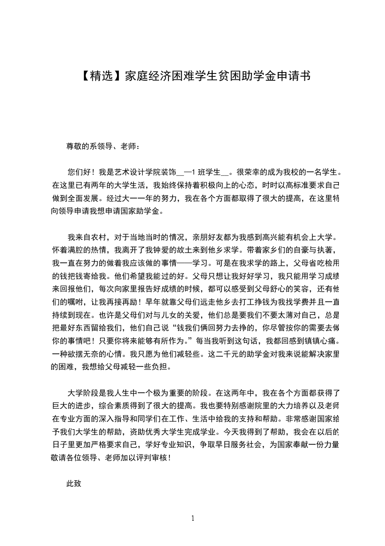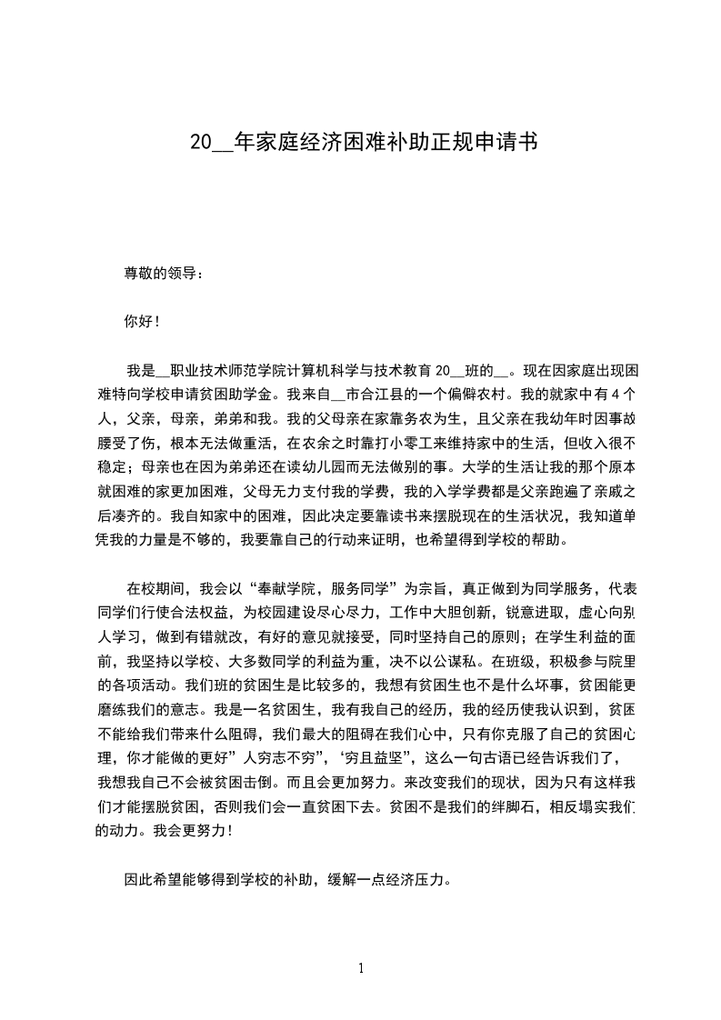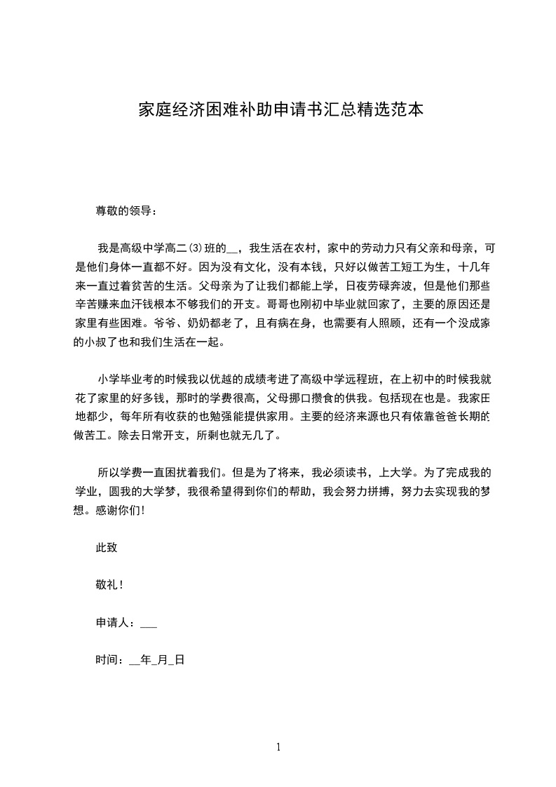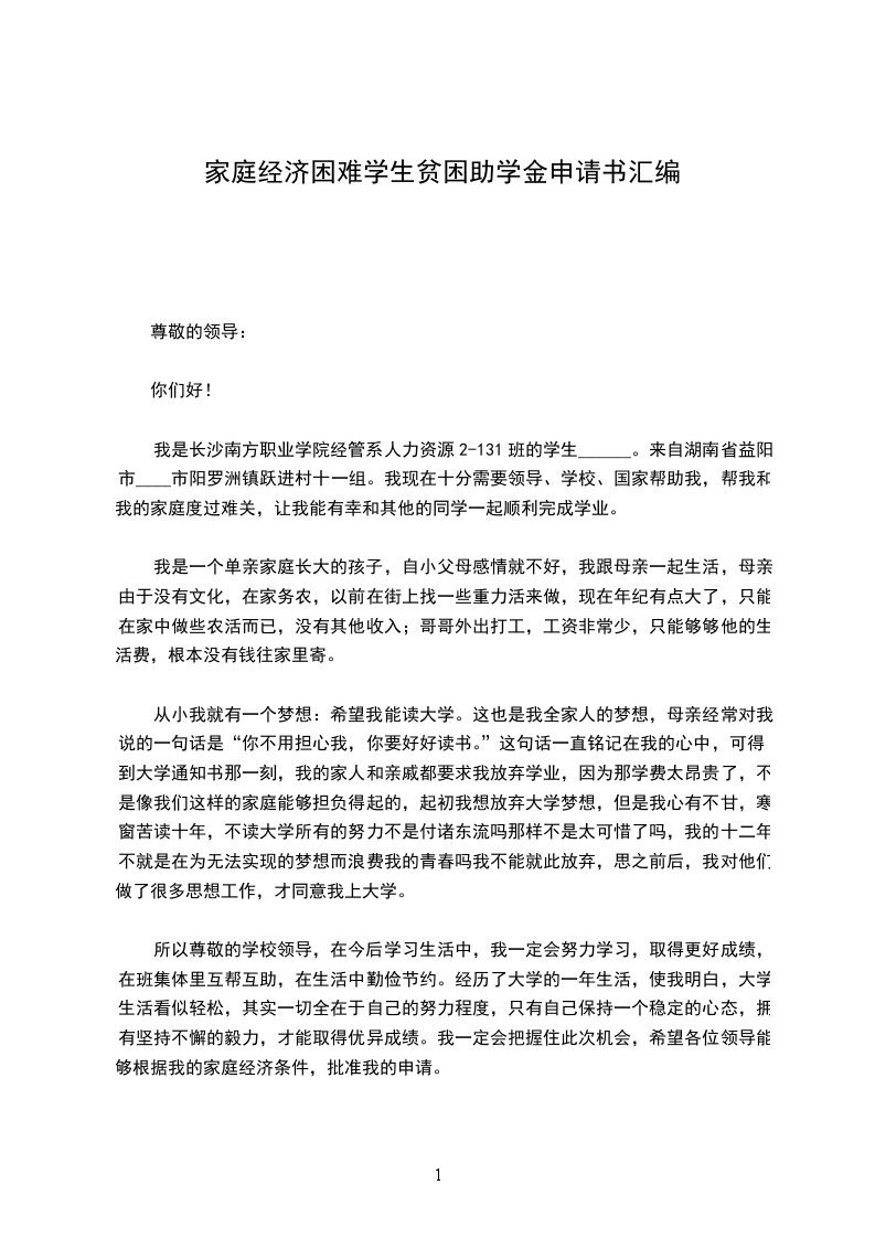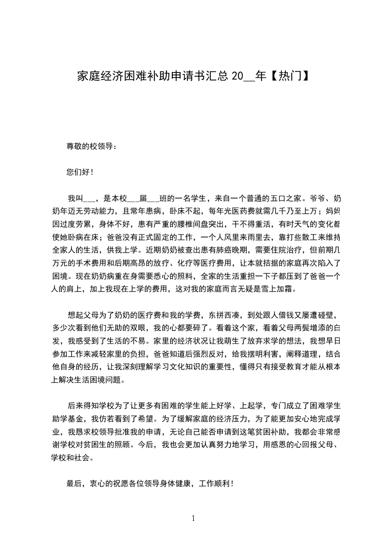 我叫___,是本校___届___班的一名学生,来自一个普通的五口之家。爷爷、奶奶年迈无劳动能力,且常年患病,卧床不起,每年光医药费就需几千乃至上万;妈妈因过度劳累,身体不好,患有严重的腰椎间盘突出,干不得重活,有时天气的变化都使她卧病在床;爸爸没有正式固定的工作,一个人风里来雨里去,靠打些散工来维持全家人的生活,供我上学。近期奶奶被查出患有肺癌晚期,需要住院治疗,但前期几万元的手术费用和后期高昂的放疗、化疗等医疗费用,让本就拮据的家庭再次陷入了困境。现在奶奶病重在身需要悉心的照料,全家的生活重担一下子都压到了爸爸一个人的肩上,加上我现在上学的费用,这对我的家庭而言无疑是雪上加霜。