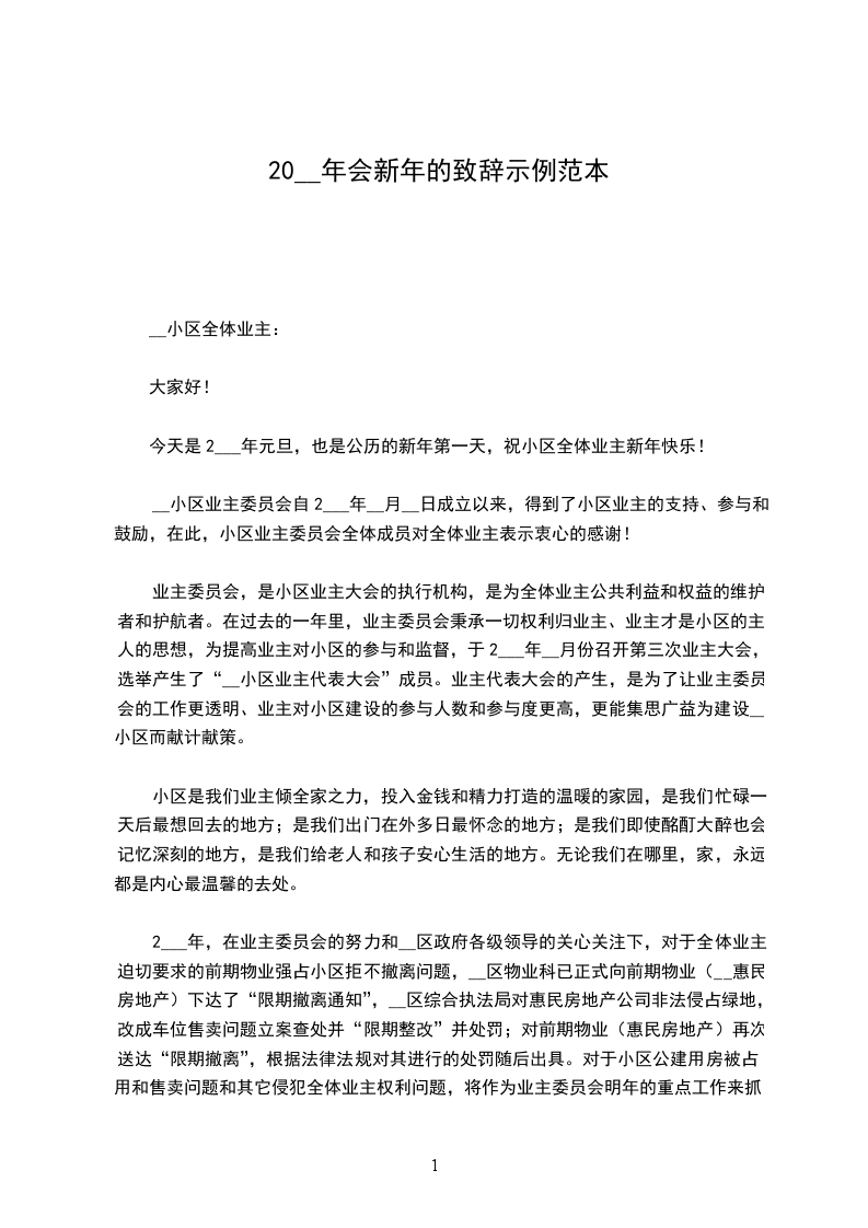 在到来的2___年,__小区业主委员、__小区业主代表们,一定继续以全体业主权益最大化为工作目标,以建设和谐、幸福__为己任,为__小区美好的明天而努力!