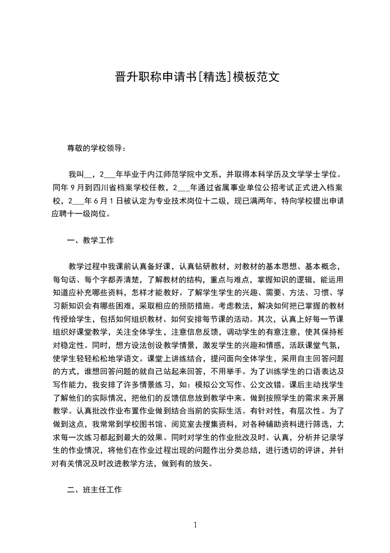 我叫__,2___年毕业于内江师范学院中文系,并取得本科学历及文学学士学位。同年9月到四川省档案学校任教,2___年通过省属事业单位公招考试正式进入档案校,2___年6月1日被认定为专业技术岗位十二级,现已满两年,特向学校提出申请应聘十一级岗位。