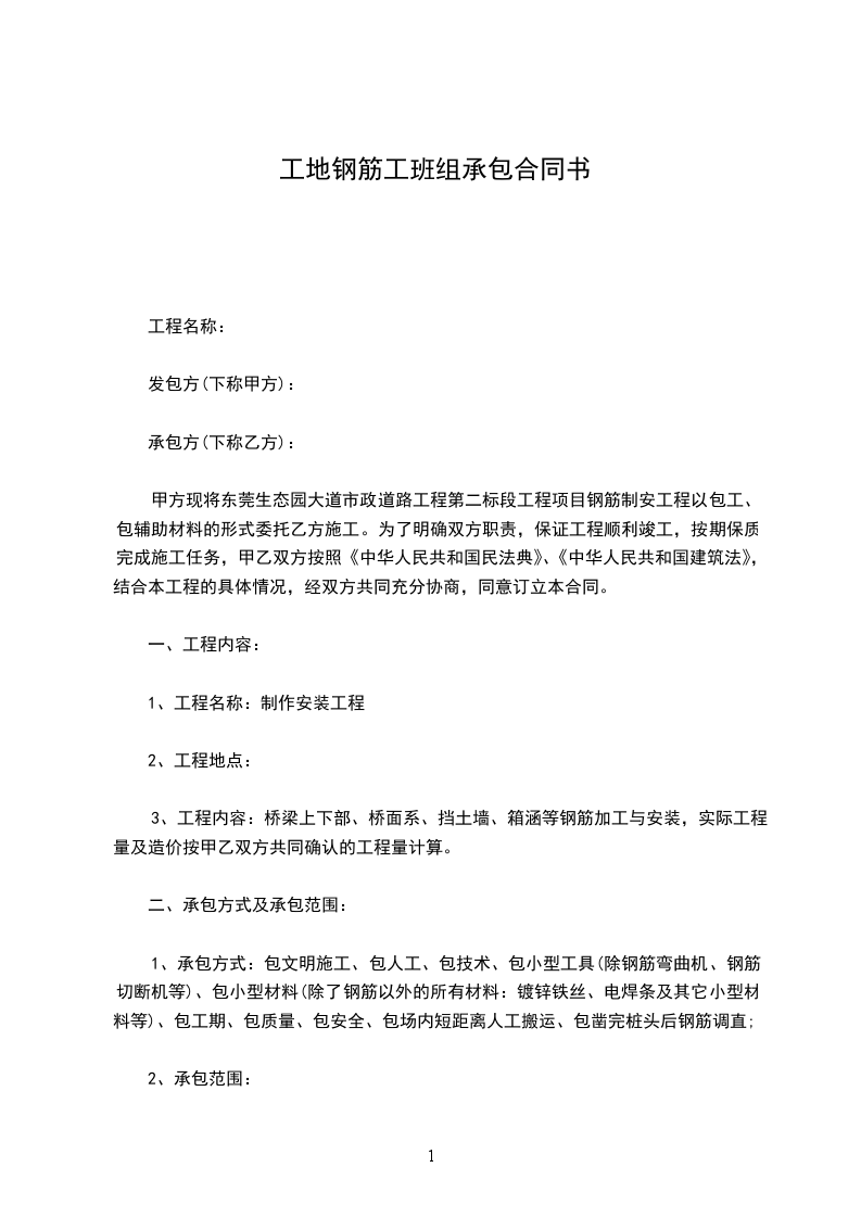 甲方现将东莞生态园大道市政道路工程第二标段工程项目钢筋制安工程以包工、包辅助材料的形式委托乙方施工。为了明确双方职责,保证工程顺利竣工,按期保质完成施工任务,甲乙双方按照《中华人民共和国民法典》、《中华人民共和国建筑法》,结合本工程的具体情况,经双方共同充分协商,同意订立本合同。
