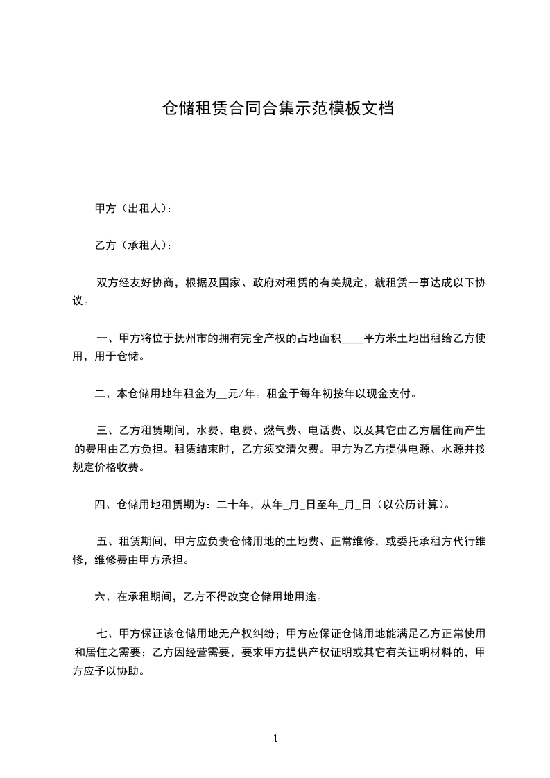 一、甲方将位于抚州市的拥有完全产权的占地面积____平方米土地出租给乙方使用,用于仓储。