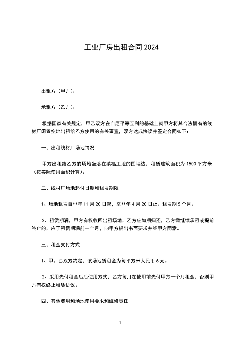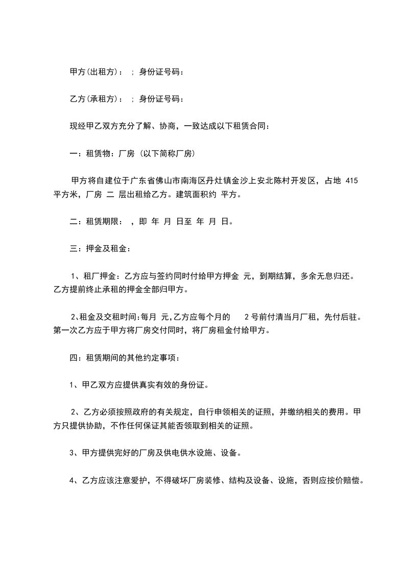 1、租厂押金:乙方应与签约同时付给甲方押金 元,到期结算,多余无息归还。乙方提前终止承租的押金全部归甲方。