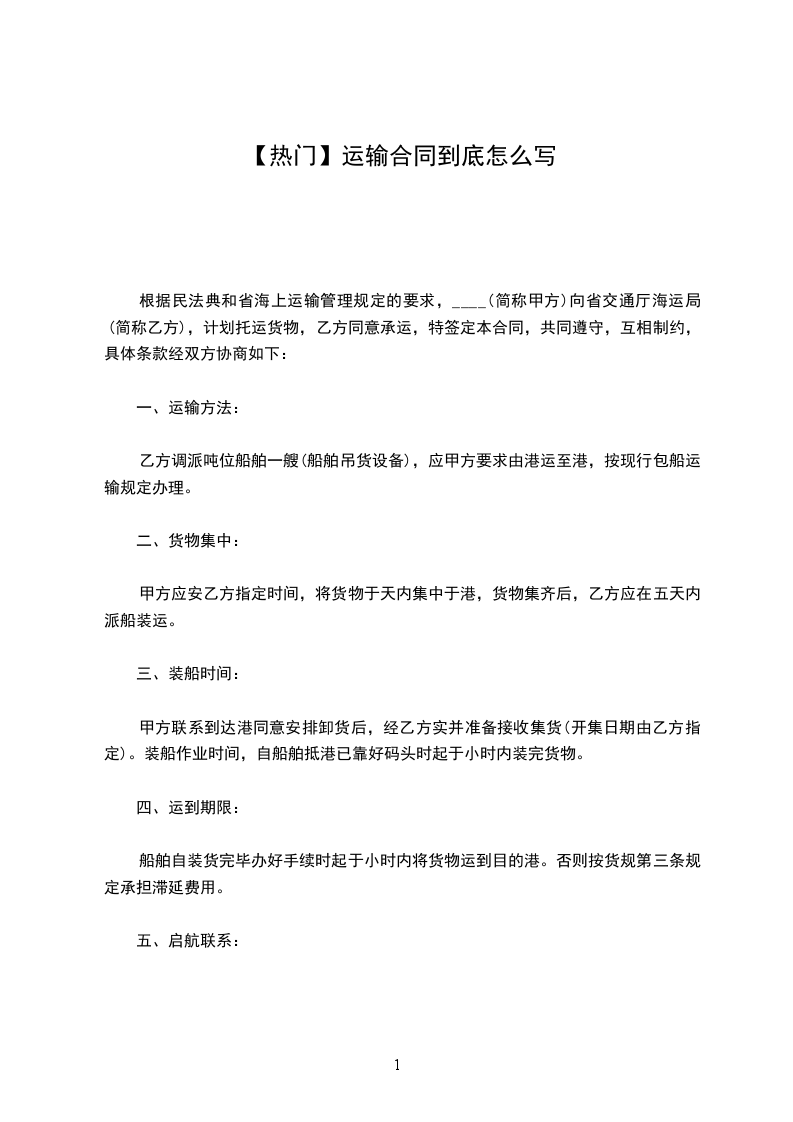 根据民法典和省海上运输管理规定的要求,____(简称甲方)向省交通厅海运局(简称乙方),计划托运货物,乙方同意承运,特签定本合同,共同遵守,互相制约,具体条款经双方协商如下: