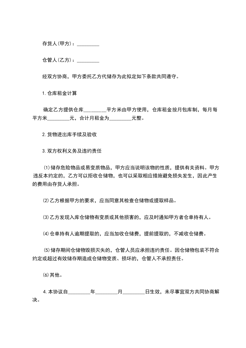 1.为了提高仓库使用率,确保物资安全,经协商,确定乙方提供仓库平方米由甲方使用,仓库租金按月包库制,每月每平方米____元,合计月租金为__元整。