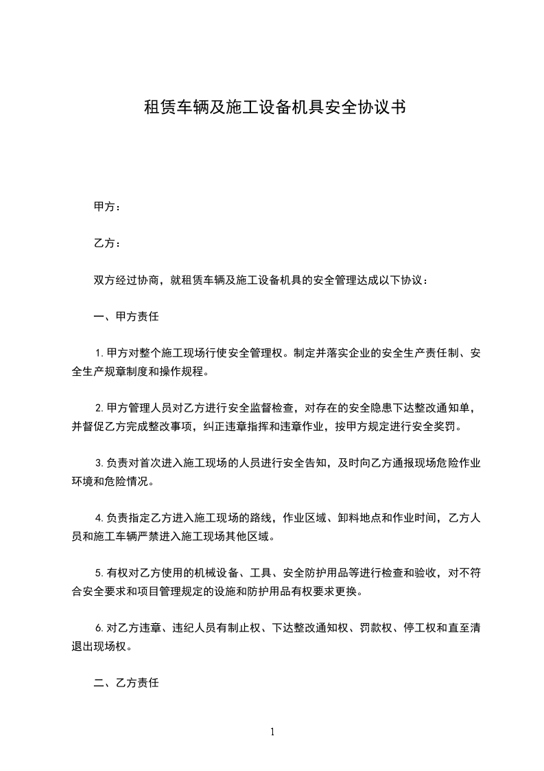 双方经过协商,就租赁车辆及施工设备机具的安全管理达成以下协议: