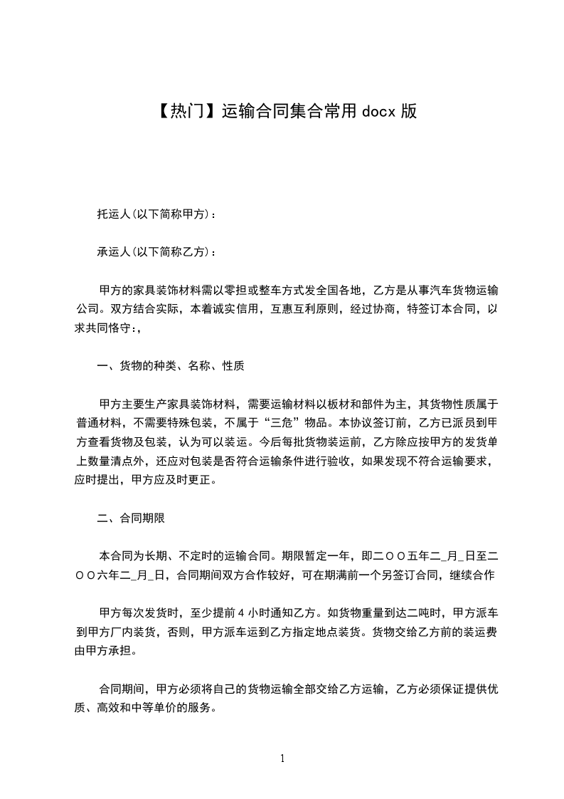 本合同为长期、不定时的运输合同。期限暂定一年,即二OO五年二_月_日至二OO六年二_月_日,合同期间双方合作较好,可在期满前一个另签订合同,继续合作。