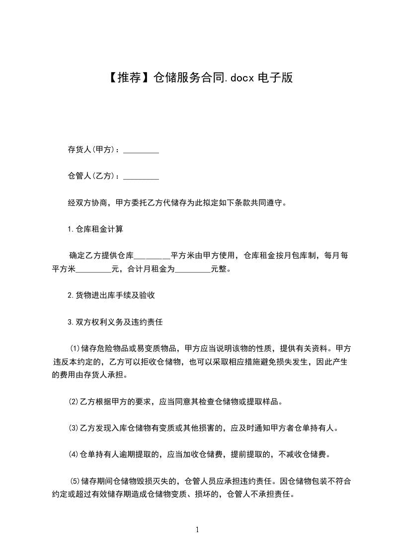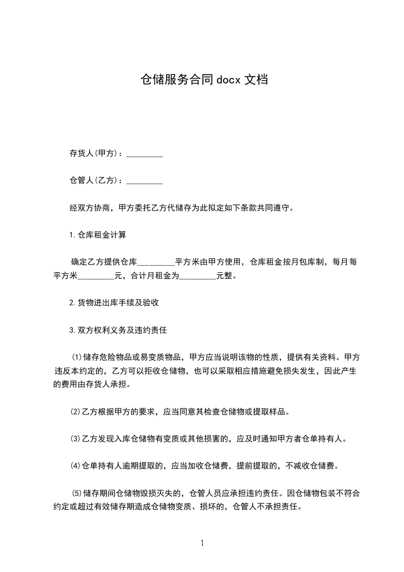 确定乙方提供仓库_________平方米由甲方使用,仓库租金按月包库制,每月每平方米_________元,合计月租金为_________元整。