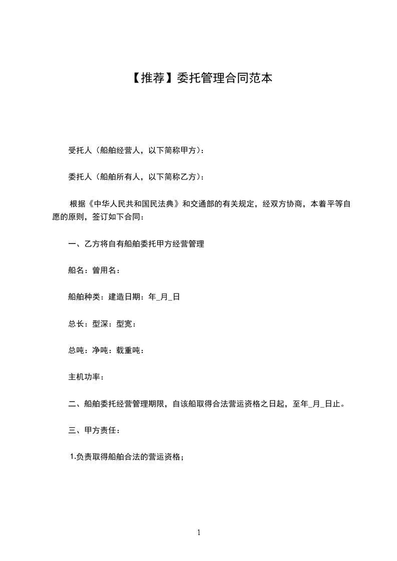一、乙方将自有船舶委托甲方经营管理
