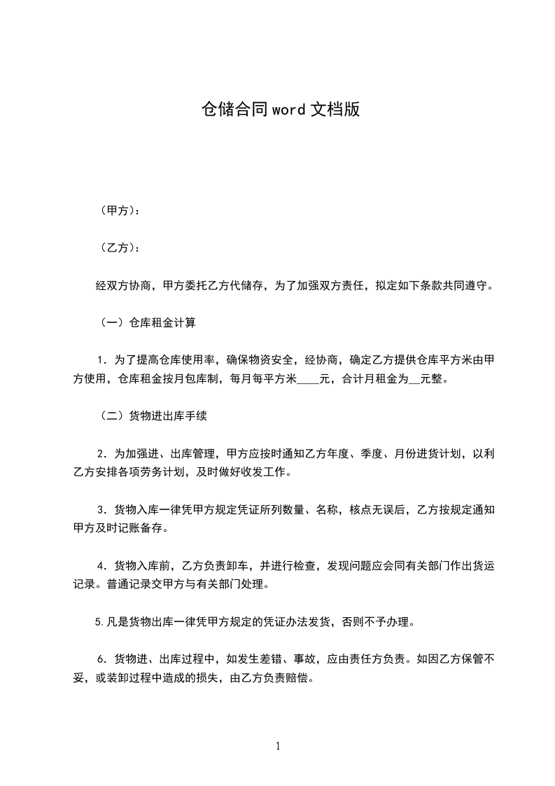 确定乙方提供仓库_________平方米由甲方使用,仓库租金按月包库制,每月每平方米_________元,合计月租金为_________元整。